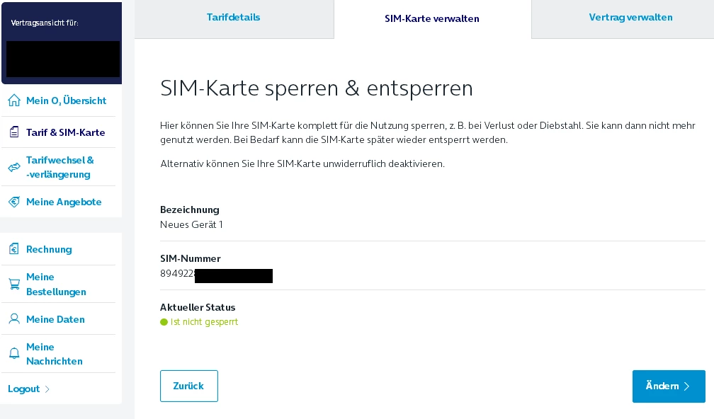 Auch kann man die Karte in mein-O2 temporär sperren und wieder entsperren.