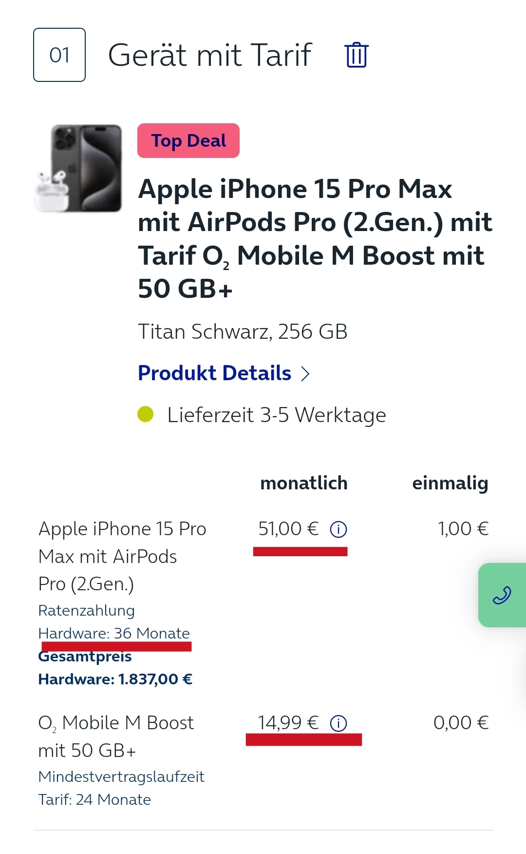 Bei dem Angebot läuft das iPhone über 36 Monate Ratenzahlung ​​​​​​, der M Boost über 24 Monate MVLZ, erhält aber 36 Monate 20€ Rabatt