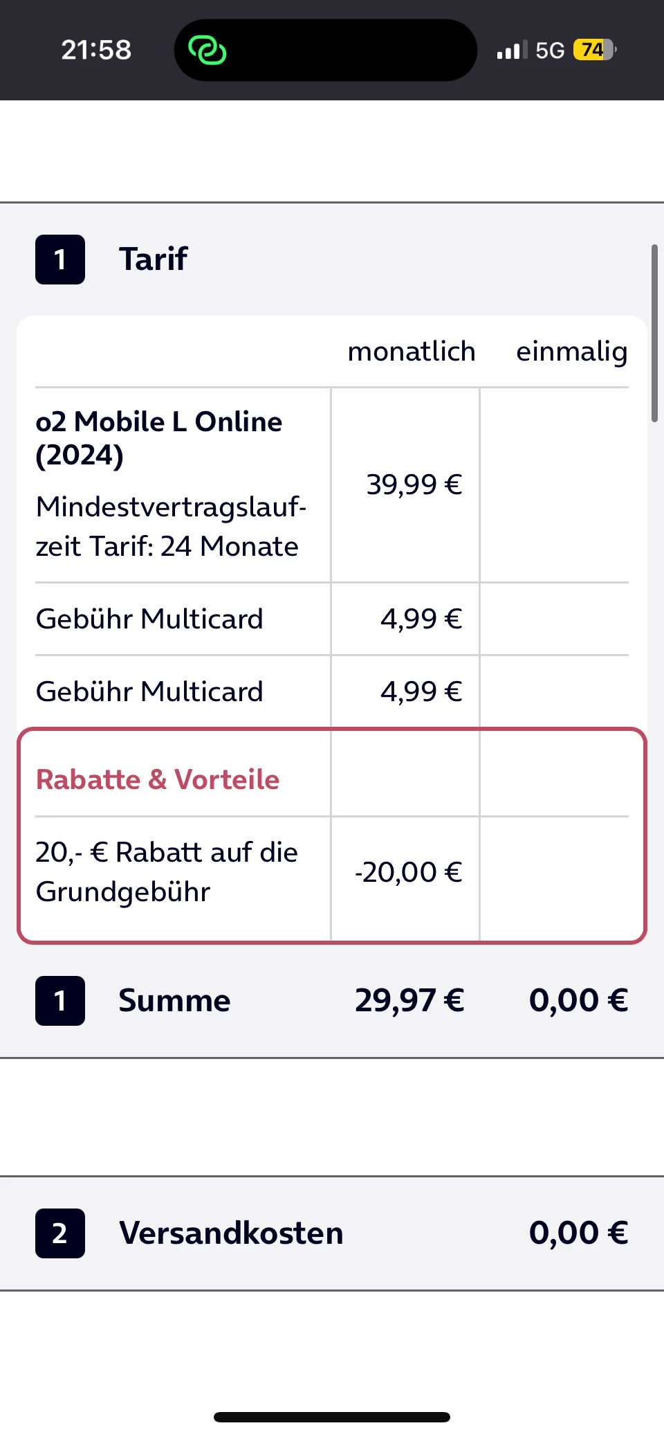Scrolle im Angebot ein wenig runter und lade dir die Vertragsinformationen runter. Steht in der VZ Connect 0 EUR, bezahlst du 19,99 EUR weil die Gebühren für die Multicard entfallen.