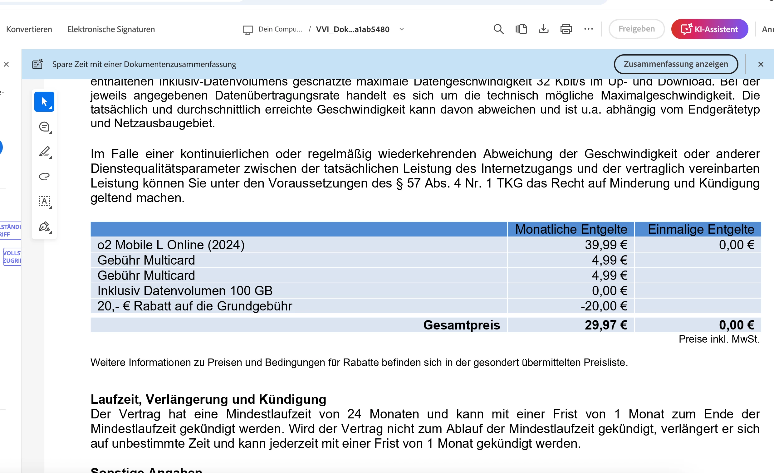 In den Vertragsbedingungen steht ebenfalls 29,97 Euro. Die Multicards werden weiterhin aufgeführt. Ich habe den Vertrag jetzt bestätigt und hoffe, dass jemand sich der Sache annimmt.