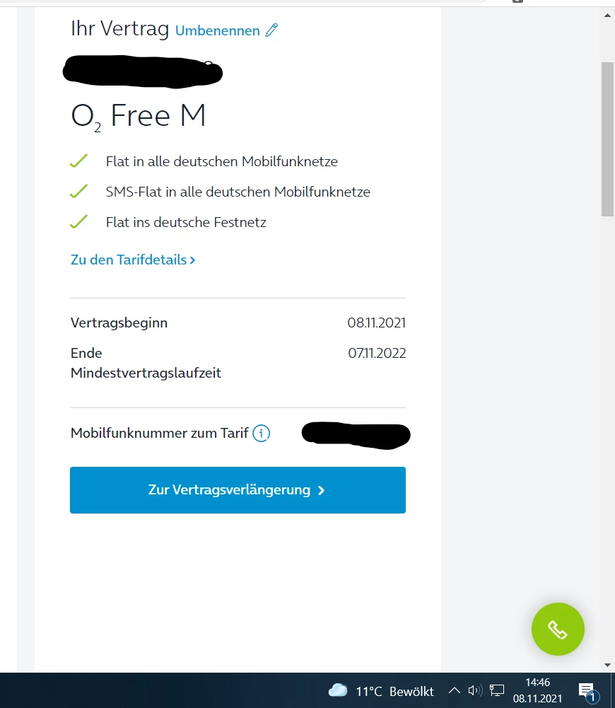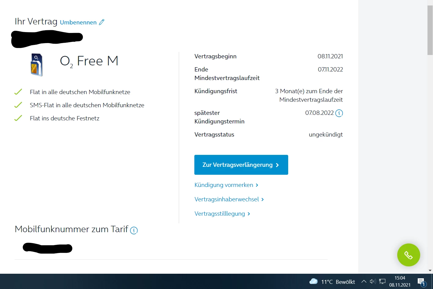 Jetzt zum 06.11.2021 sollte mein Vertrag O2 Free M mit der Rufnummer 0157xxxxxxxx98 auslaufen.