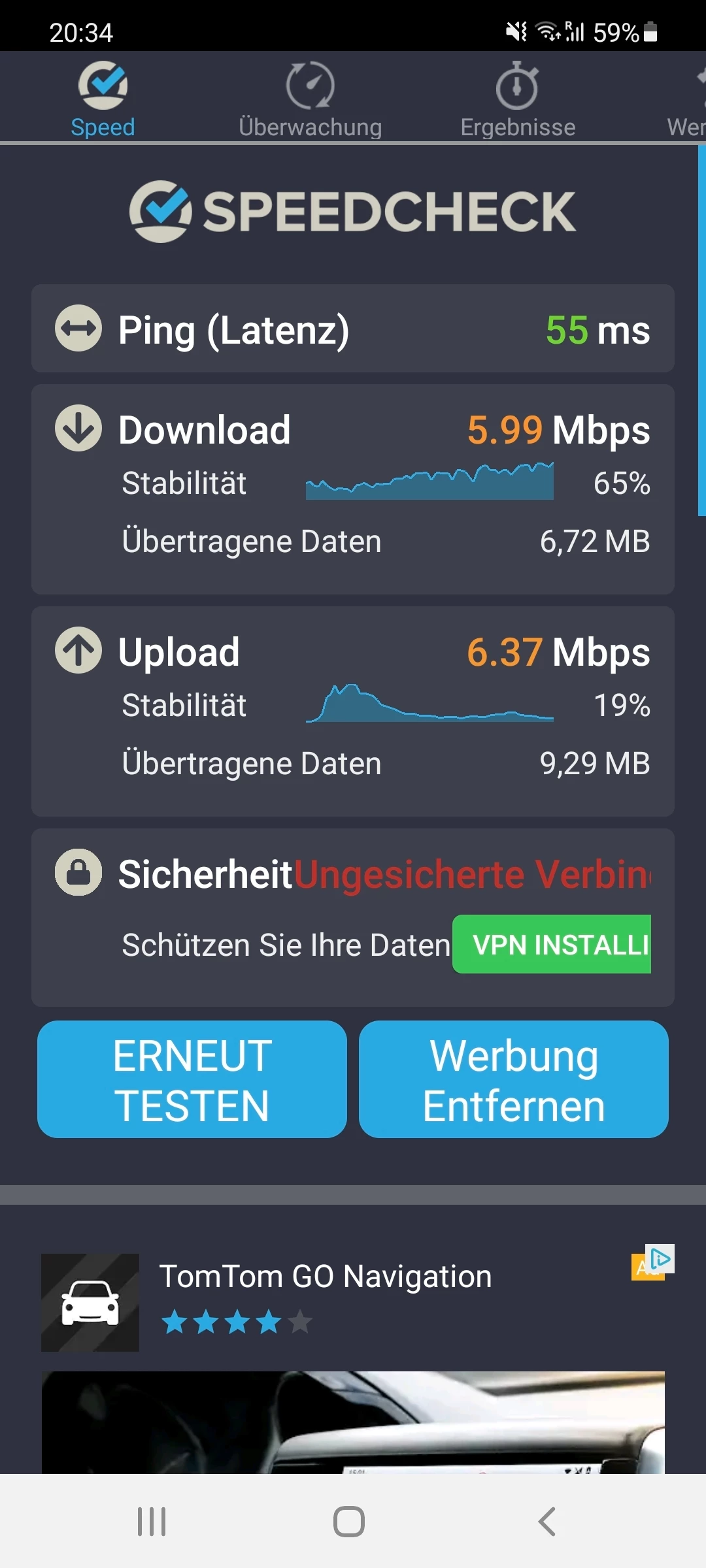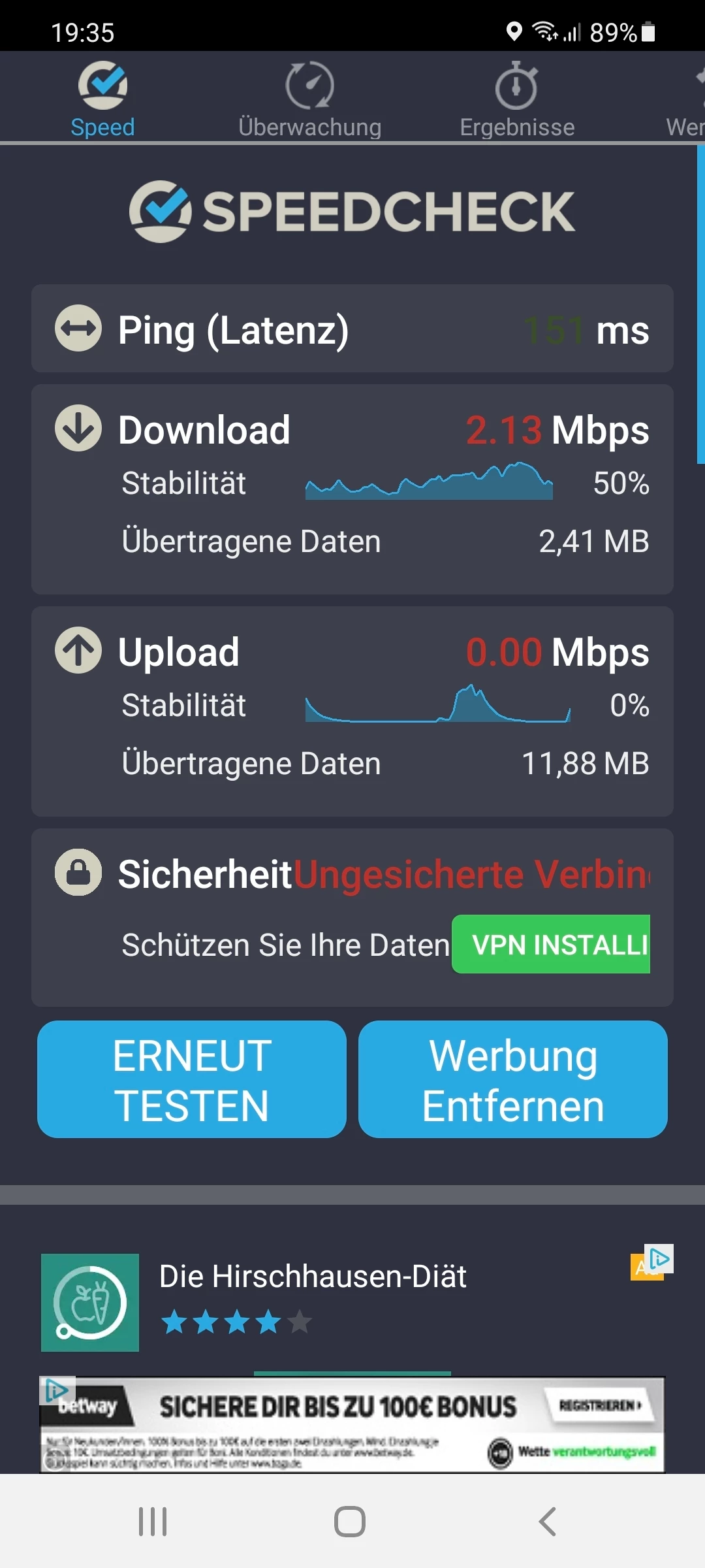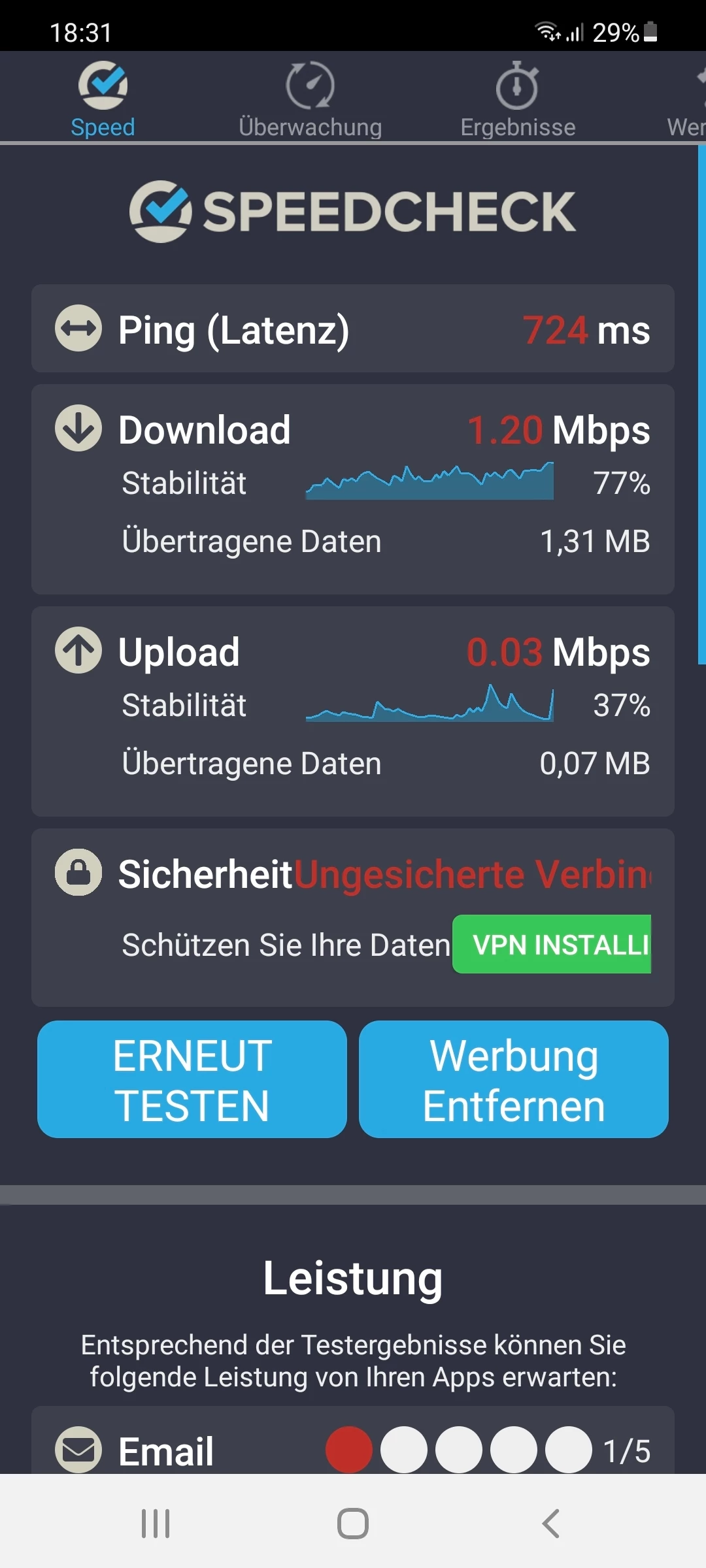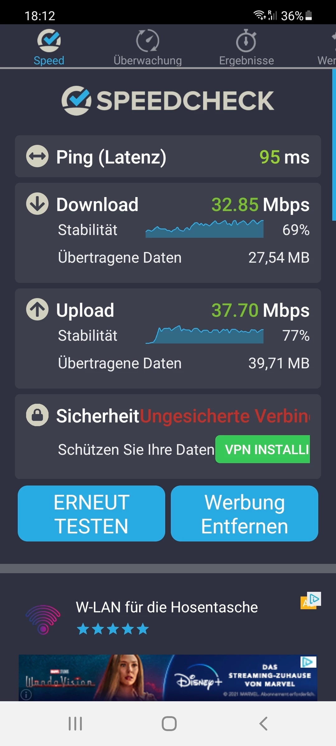 Vorweg kann ich schonmal sagen das es eindeutig nicht am tragbaren Router liegt, er schafft mehr Leistung als mir  bekannt war.
