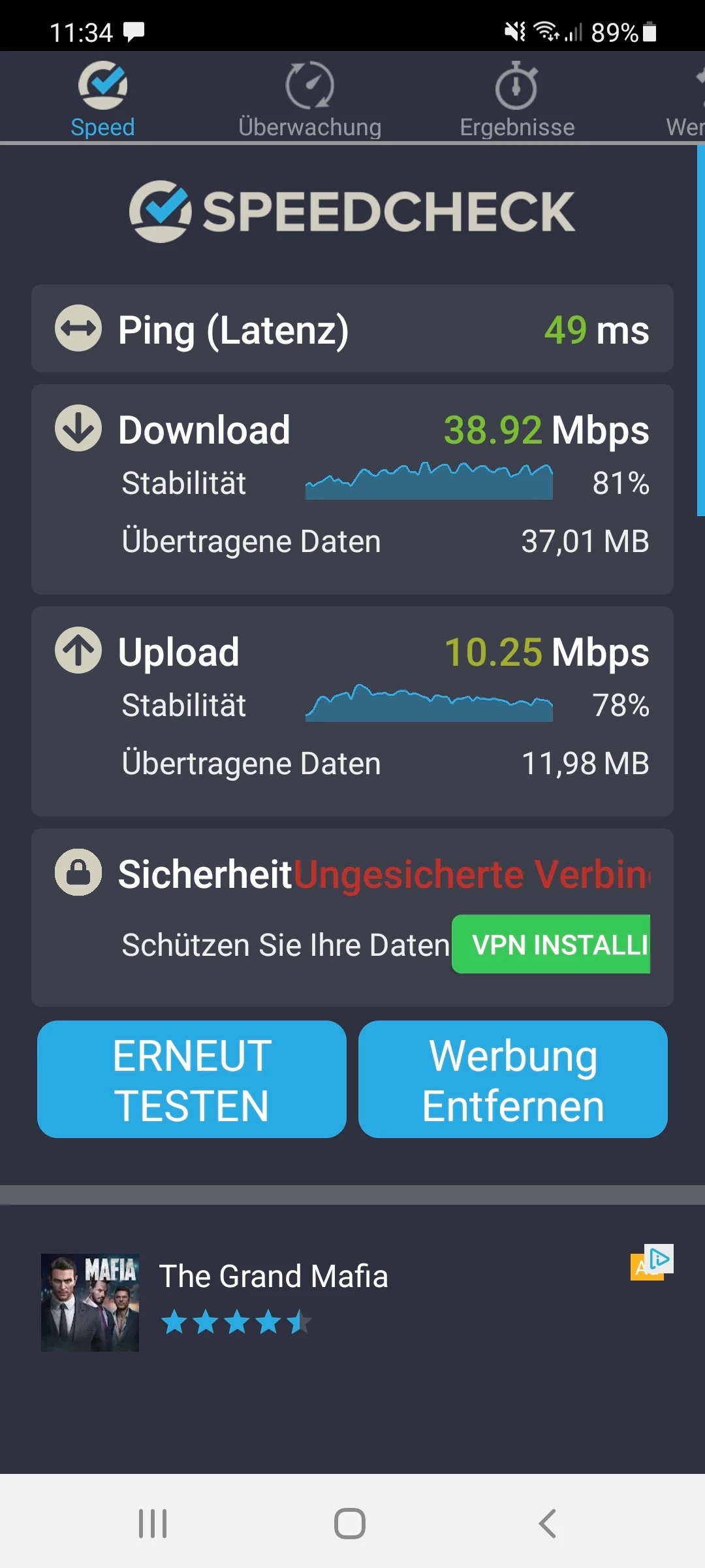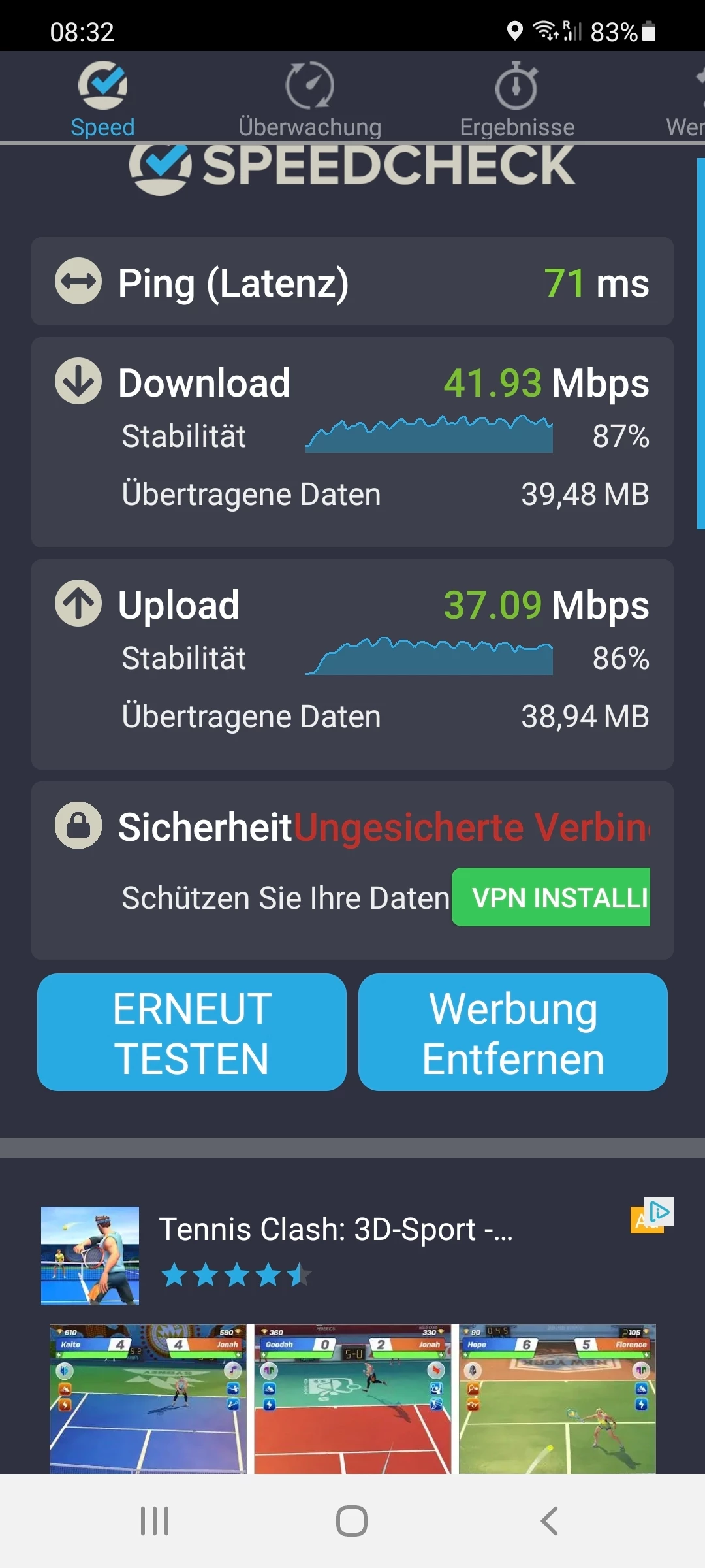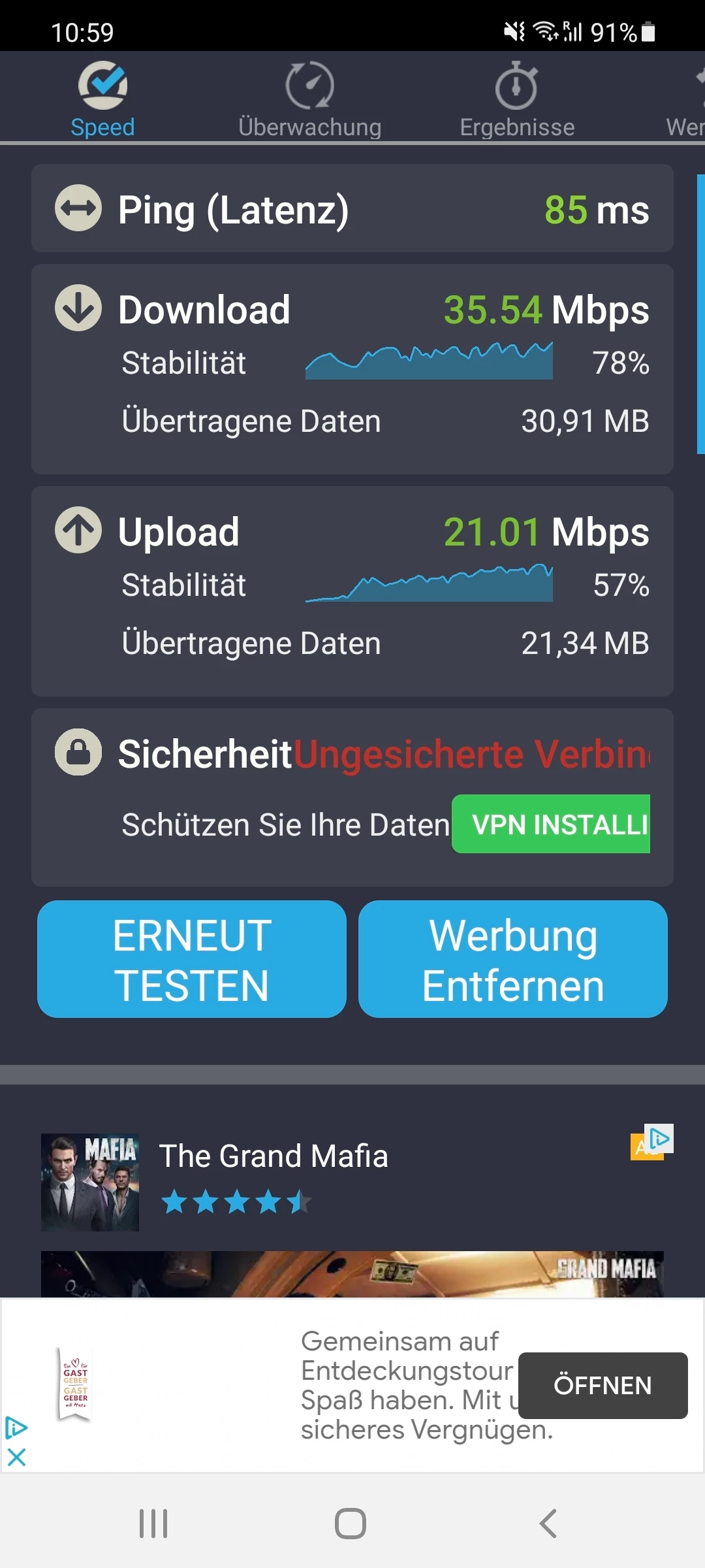Also ich habe diverse Speedtest gemacht. Im Anhang sind dann in chronologischer Reihenfolge die Screenshots vom Test.