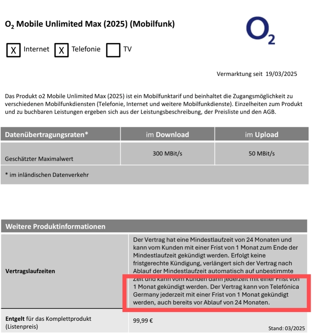 Zusätzlich ist mir aufgefallen, dass die Bestätigungs-E-Mail kein Produktblatt für diesen Tarif enthält. Damit fehlen mir die gesetzlich vorgeschriebenen Informationen zur Tarifstruktur, zu Limits und Geschwindigkeiten, was die Intransparenz des Angebots noch verstärkt.