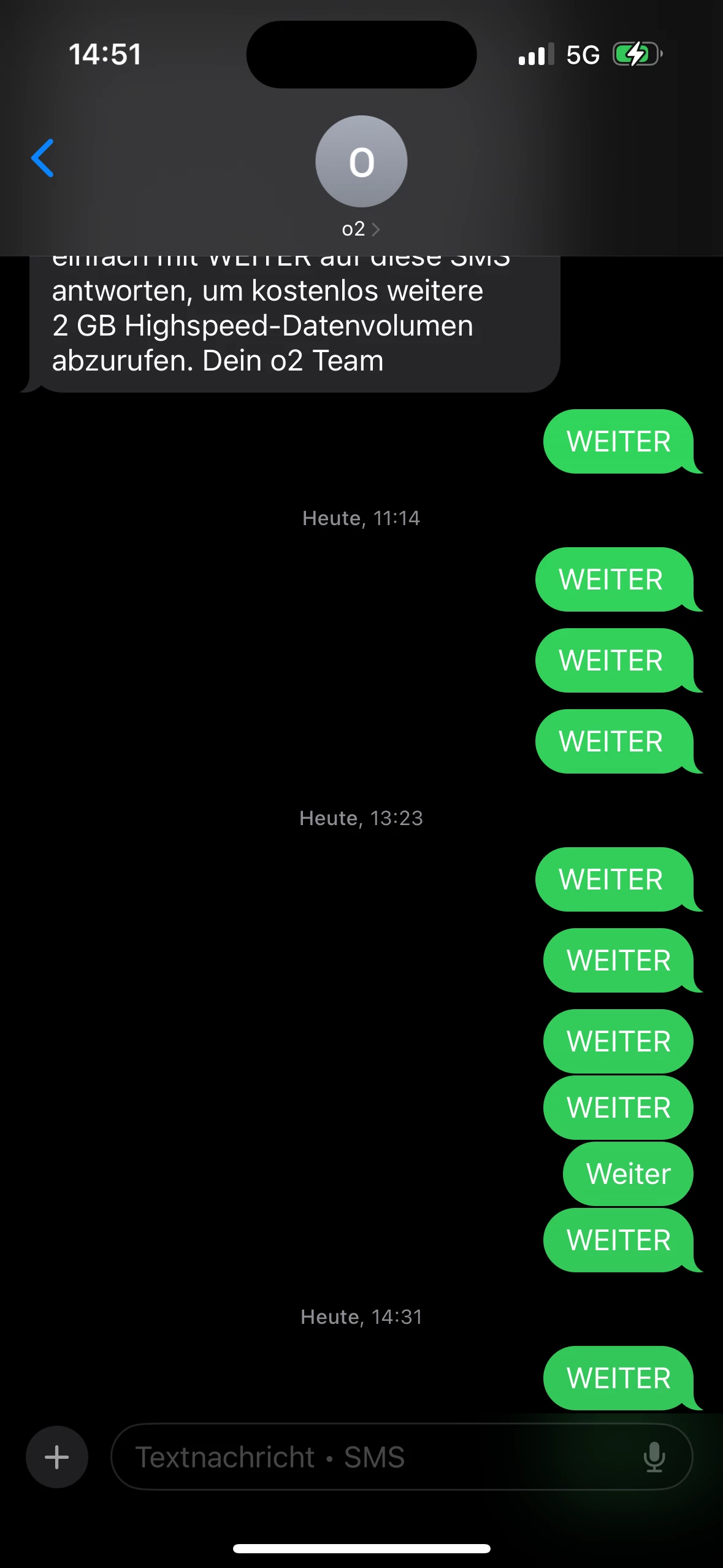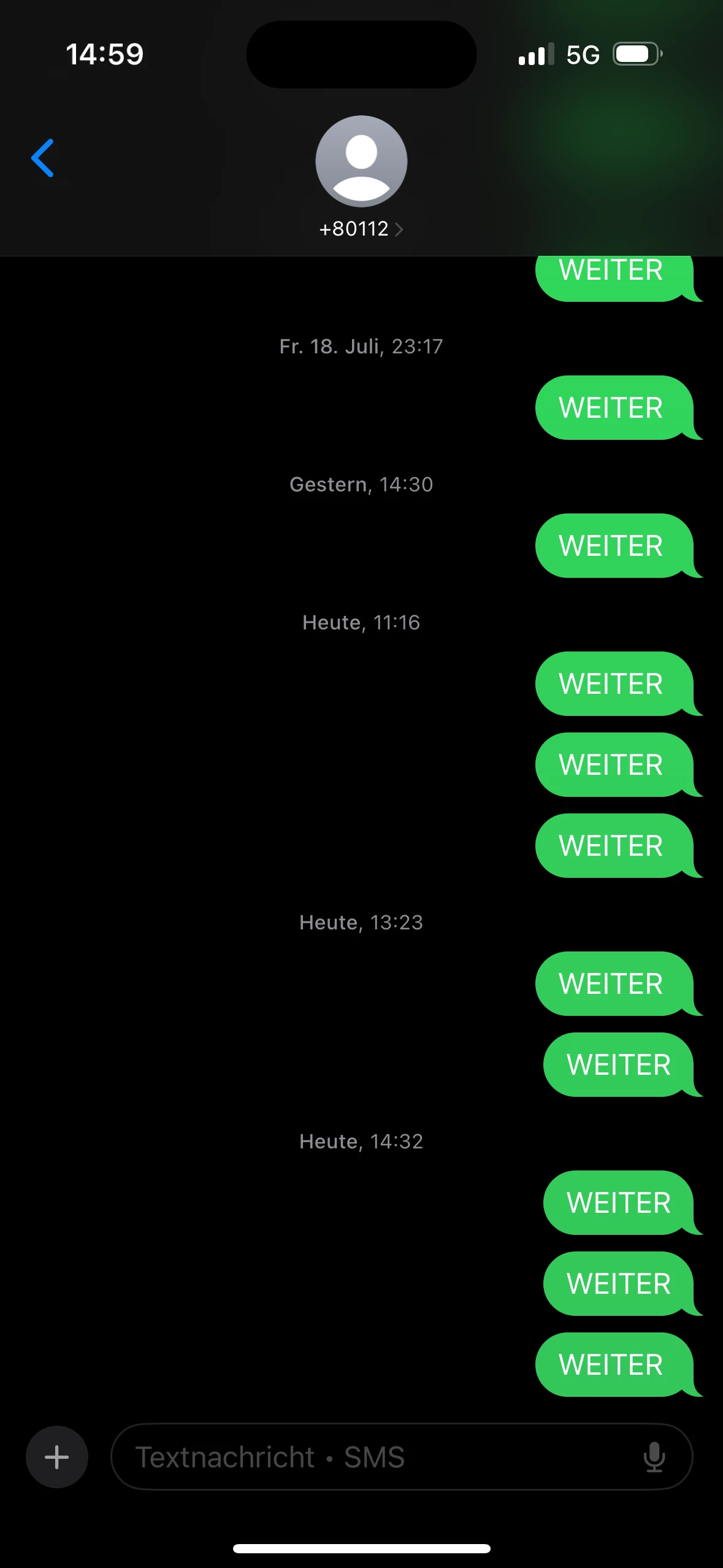 Du nutzt ein iPhone? Starte eine neue Konversation über die Nachrichten App an die Nummer +80112. Es öffnet sich ein Antwortenfeld wo du mit WEITER antwortest.
