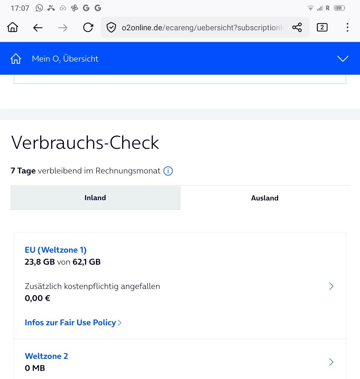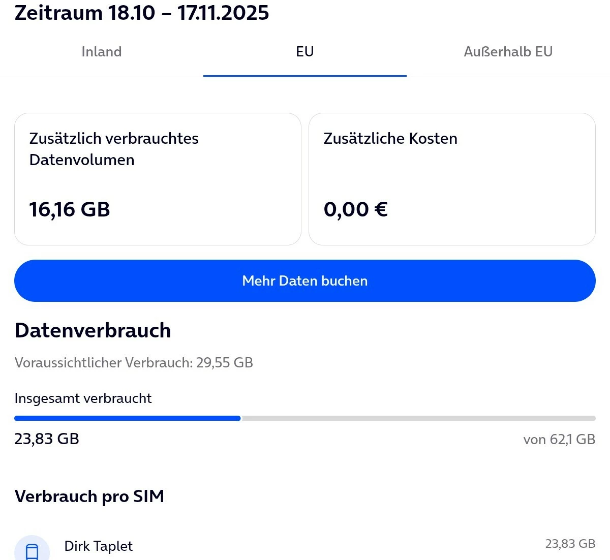 Guten Morgen. Ich binn seit 4 Wochen in Spanien/Portugal und habe 62,5 GB zur Verfügung.In der Verbrauchsanzeige steht mein Verbrauch im Ausland EU aber auch ein zusätzlicher Verbrauch .Wo kommt der her ,ich war nur in der Eu