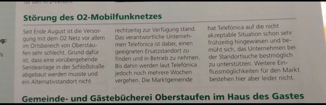 Hallo @o2_Steffen , die Störung ist in Oberstaufen. Anbei auch ein Zeitungsbericht, die den Ausfall seit Ende August bestätigt.