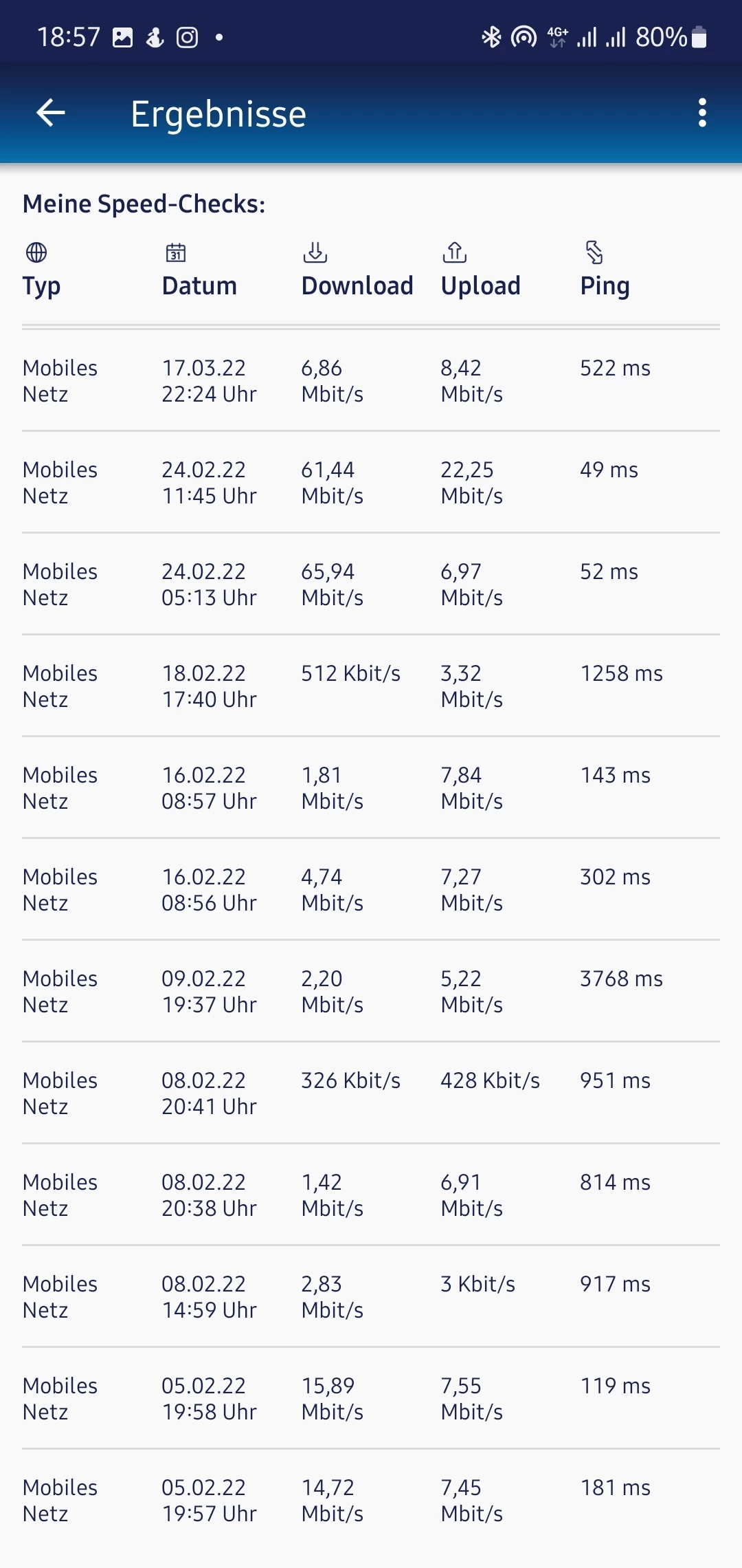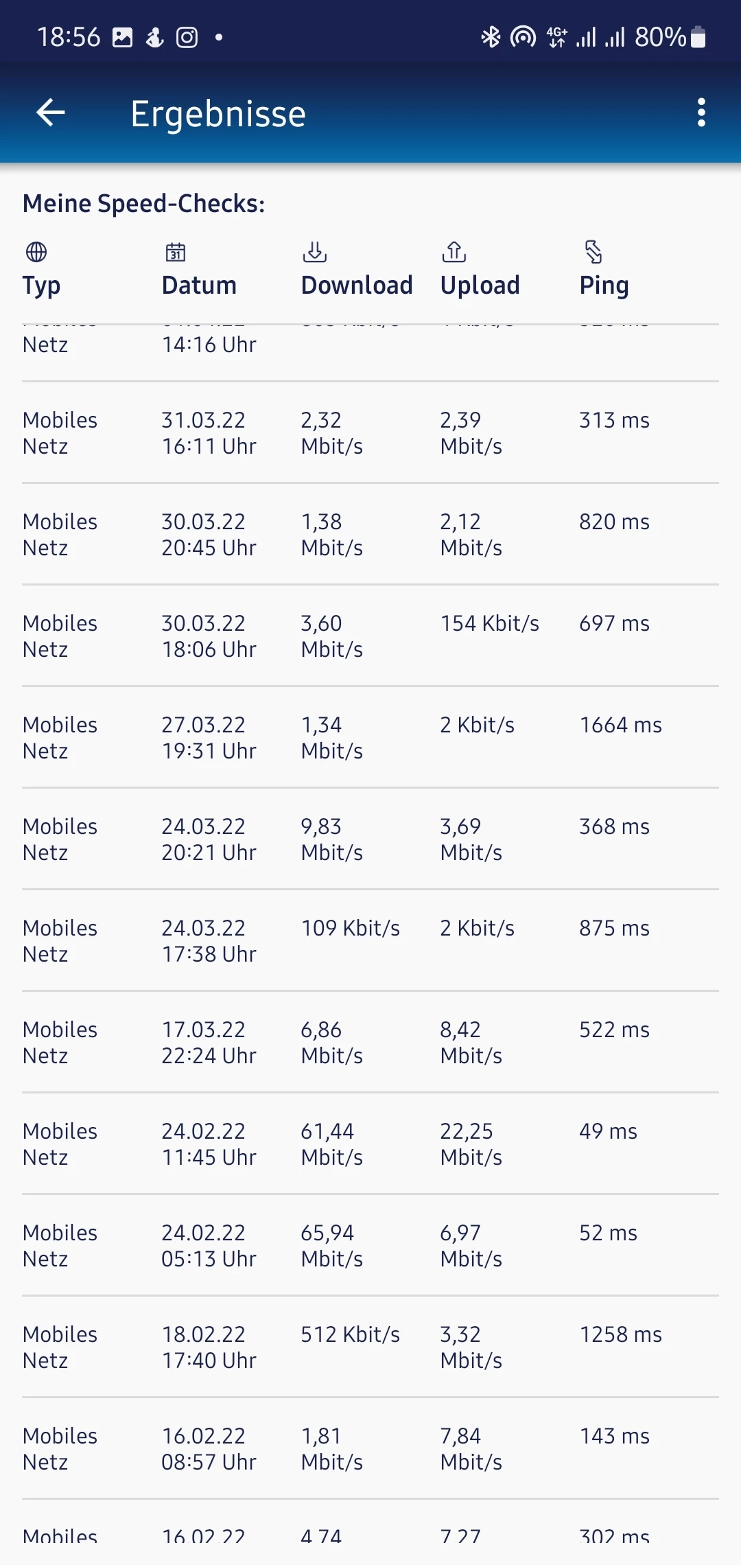 Die Speedcheck Daten sind alle von meiner Wohnadresse. Da es öfters vorgekommen ist das ich  überhaupt kein Internet empfangen konnte. In diesen Zeiten konnte ich kein Speedcheck durchführen.