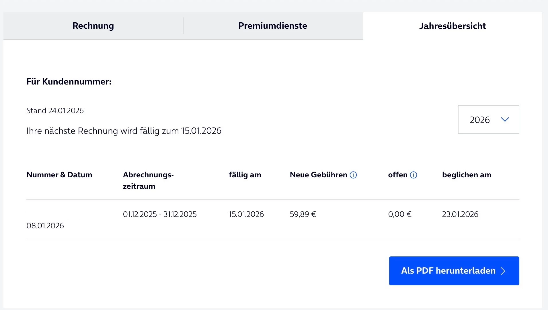 was steht im Kundenportal bei Rechnung/Jahresübersicht? Offen oder beglichen? Wenn beglichen welches Datum? Und zu welchen Datum war die letzte Rechnung fällig? Der Whitelabel resultiert aus einem Zahlungsproblem.