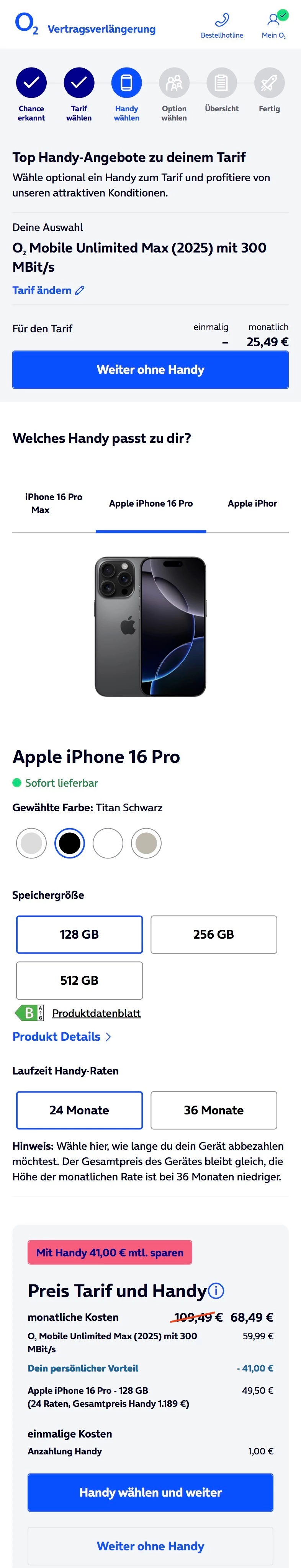 Wenn ich ein Handy dazu wähle, steigt der Rabatt für den Tarif nochmal etwas an. Es ist aber nirgendwo ersichtlich, ob dieser dann auch dauerhaft ist oder für 24 Monate befristet.