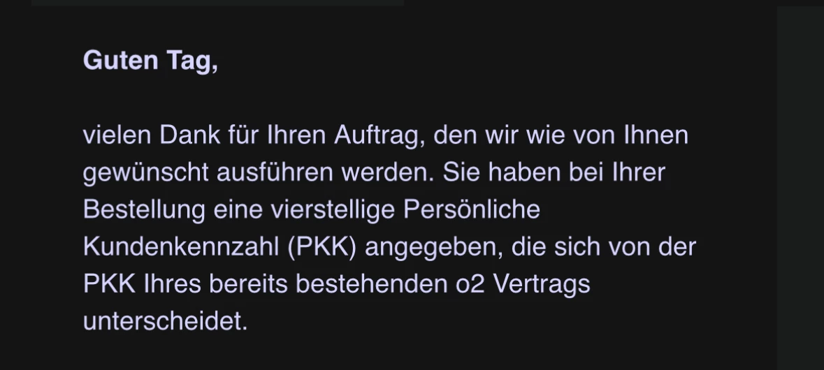 die E-Mail von deinem Screenshot kommt wenn man schon bestehender Kunde ist, und einen Neuvertrag mit einer abweichenden PKK bestellt. Das ist keine Ablehnung sondern nur der Hinweis das sich deine bisherige PKK nicht ändert und der Neuvertrag deinen bestehenden Kundenkonto zugefügt wird.