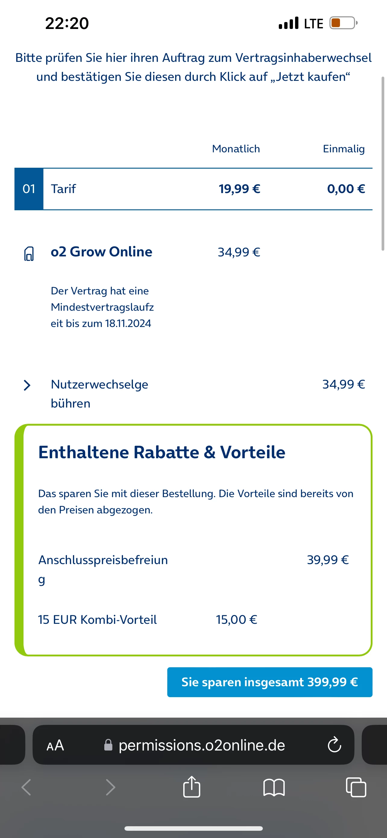 Es ist wirklich schön zu sehen, wie ihr euch zusammentut, um euch vor solch unseriöse Geschäftstechniken zu stellen. Ich habe in gutem Glauben gehandelt und mir wurden auf der in den Screenshots abgebildeten Seite Konditionen genannt, die sich auf den Vertrag nach dem Inhaberwechsel beziehen - nachdem ich meine persönlichen Daten und meine Rechnungsadresse eingeben habe. Hier hätte eine Prüfung stattfinden und der entfallende Rabatt angemerkt werden müssen, anstatt einen falschen Gesamtpreis direkt über dem „jetzt kaufen“ Button zu platzieren und falsche Konditionen, wie o.g., aufzuführen.