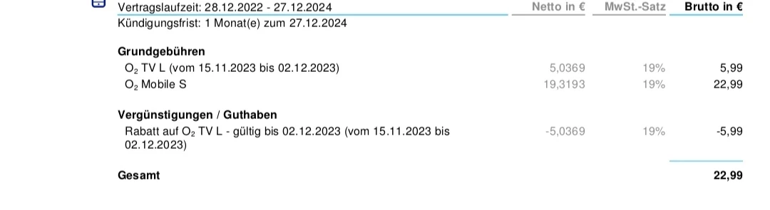 Der Vertrag o2Free S  wurde letztmalig im Dezember 2022 zu den oben erwähnten Konditionen (19,99€ - 10€ Kombivorteil und nochmals um 0,50€ monatlich rabattiert) bis zum 27.12.2024 verlängert.