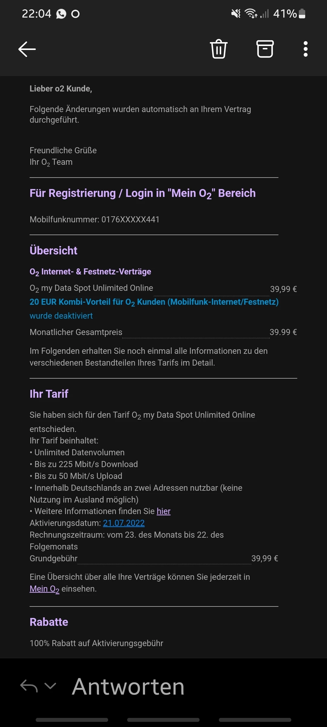 Man hat mir am 20.7 eine Vertragszusammenfassung gesendet wo drin steht das ich die 20 Euro Kombivorteil erhalte da die Verträge über den gleichen Rechnungskonto laufen und ich 2 Verträge habe.