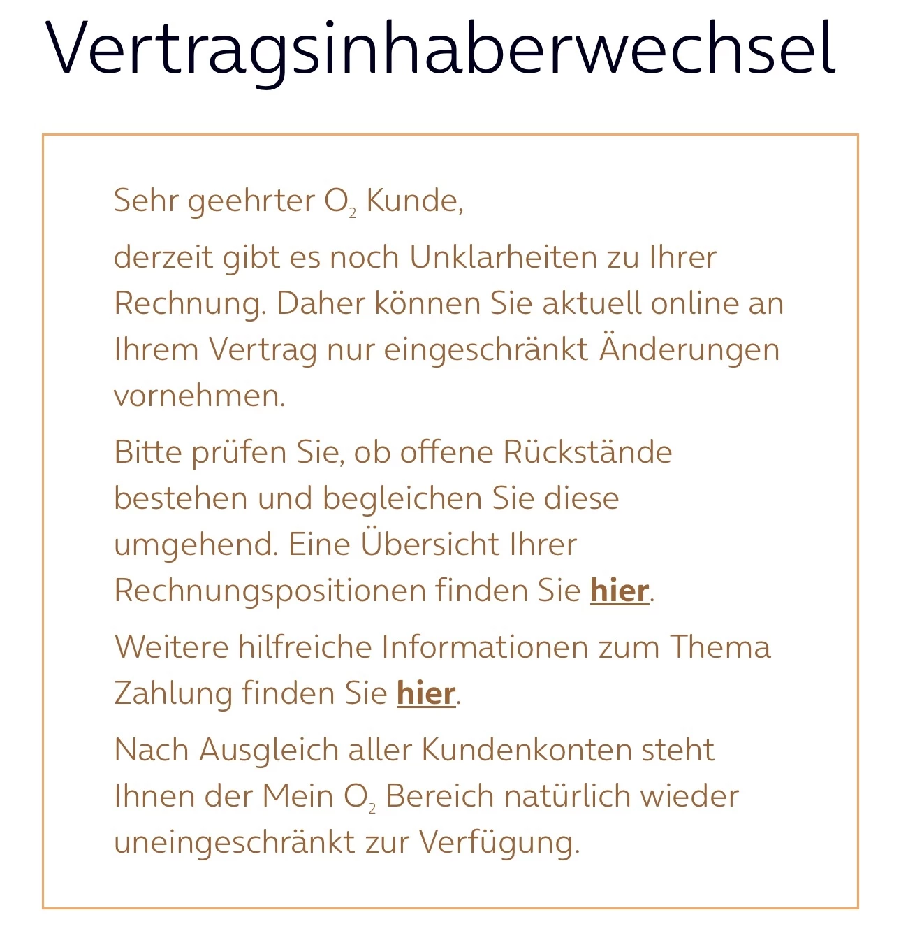 „Sehr geehrter O, Kunde, derzeit gibt es noch Unklarheiten zu Ihrer Rechnung. Daher können Sie aktuell online an Ihrem Vertrag nur eingeschränkt Änderungen vornehmen.