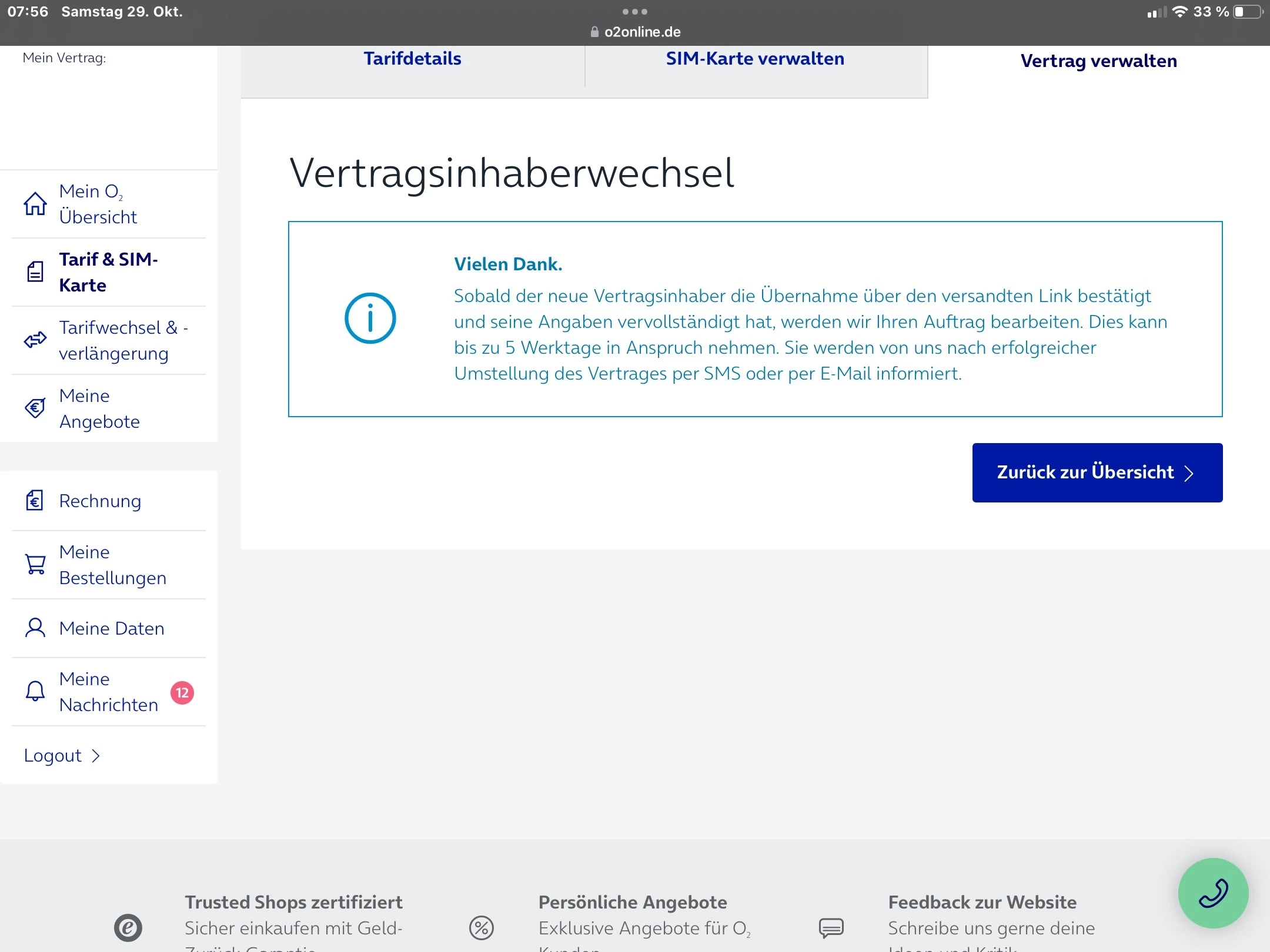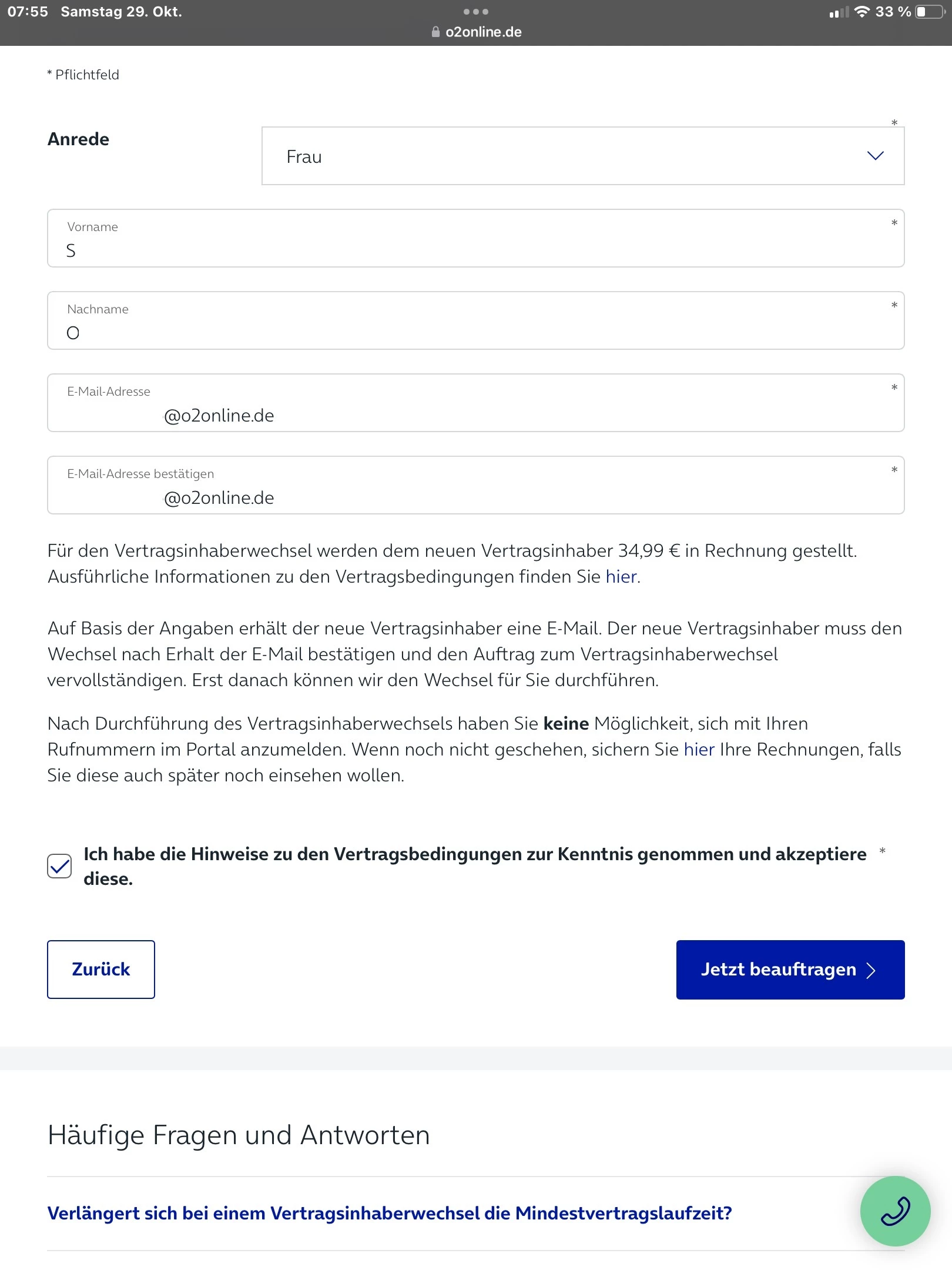 vielleicht kann mir jemand helfen. Der Vertragsinhaberwechsel klappt nicht, ich habe es im MeinO2-Bereich versucht, es wird stets die Meldung angegeben, dass der Antrag zu diesem Zeitpunkt nicht möglich ist.
