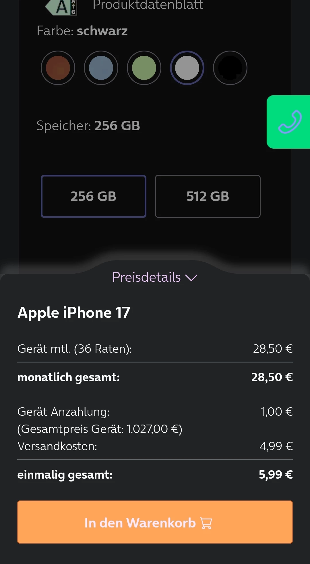 Dazu hätte ich gerne zwei iPhone 17 mit 256 GB, einmal in Weiß und einmal in Schwarz, jeweils mit 36 Monaten Ratenzahlung.