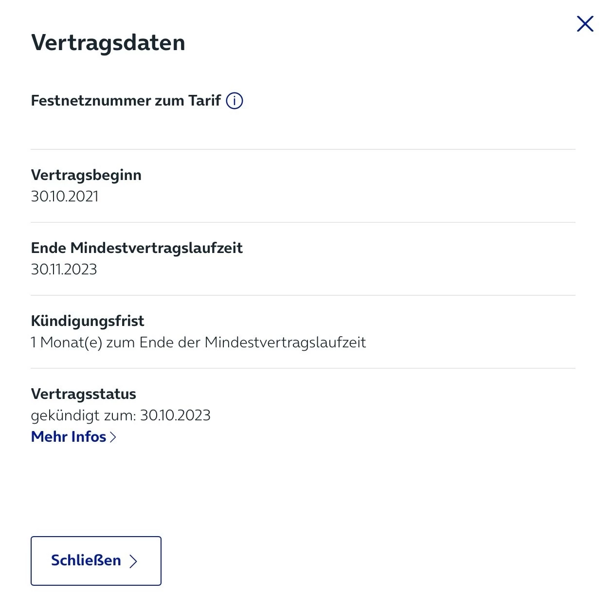 kannst du mal schauen was im Online Portal, unter Vertragsdaten beim Vertragsstatus steht?  So sieht es bei einen gekündigten Vertrag zum 30.10.2023 aus. Was steht da bei Ende Mindestvertragslaufzeit? 😉