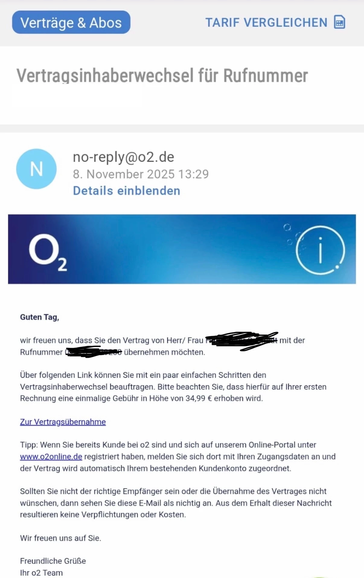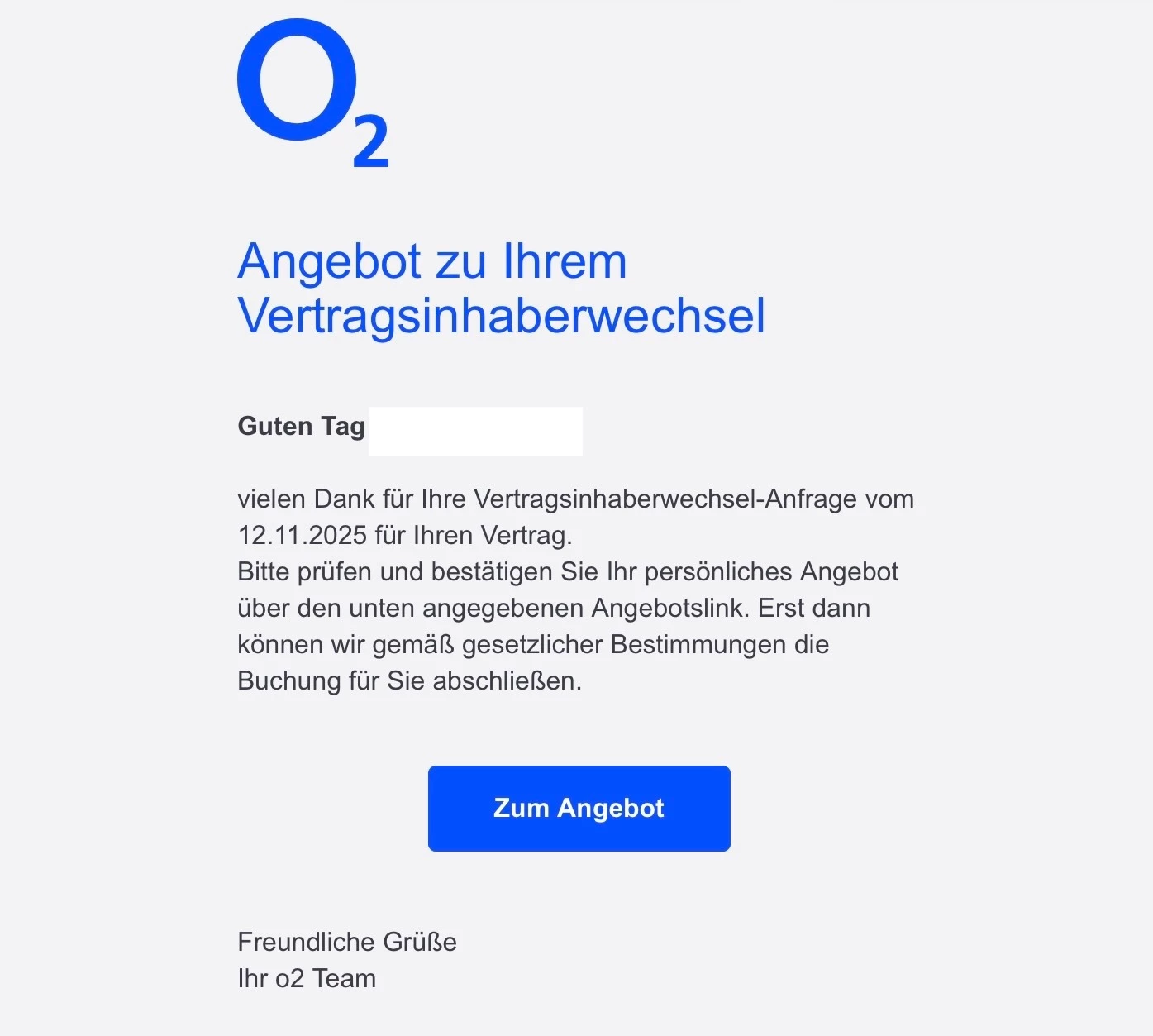 Das war die Mail, die mein Neffe bekommen hat. Er hat den Link „Zur Vertragsübernahme“ angeklickt und alles ausgefüllt. Seitdem wartet er auf eine Rückmeldung.