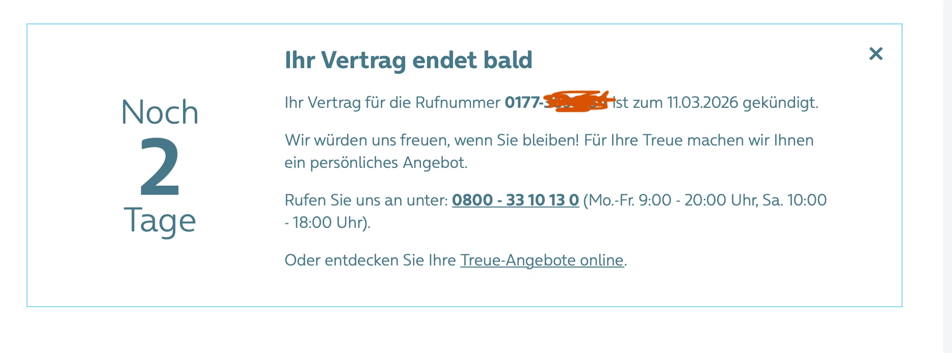 Ich habe die Termine - sofern mir welche genannt wurden - jedes Mal abgewartet. Oft hieß es aber: „Sie bekommen in 48 Stunden eine Bestätigung“ und am dritten Tag habe ich noch immer nichts erhalten. Als die Vertragsdeaktivierung aus dem System entfernt wurde, habe ich mehrmals keine Erklärung hierfür erhalten (auch nicht nach 72 Stunden). Ich habe schließlich selbst nachgefragt, ob dies mit der Rufnummerübertragung zusammenhängen kann, was dann bestätigt wurde. Daraufhin habe ich - wie abgesprochen - bis zum 09.03. gewartet (Datum der Rufnummerübertragung). Wie beschrieben habe ich nach Erhalt der Mail, dass die Übertragung abgeschlossen ist, aber gesehen, dass der Vertrag nicht storniert wurde, sondern regulär weiterläuft und eine neue Rufnummer bekommen hat. Erst daraufhin habe ich o2 erneut kontaktiert, bis der Fehler erkannt wurde und der 11.03. festgelegt wurde (bis zum 10.03. war dieses Datum nicht festgelegt!). Heute ist der 12.03. und der Vertrag ist noch immer aktiv. Außerdem hat sich Anzeige wieder auf „läuft in 2 Tagen aus“ aktualisiert (siehe Foto). Ich beschäftige mich seit über einem Monat mit dem Thema und habe leider die Erfahrung gemacht, dass als ich zwei Wochen vertrauensvoll abgewartet habe, nichts  passiert ist.