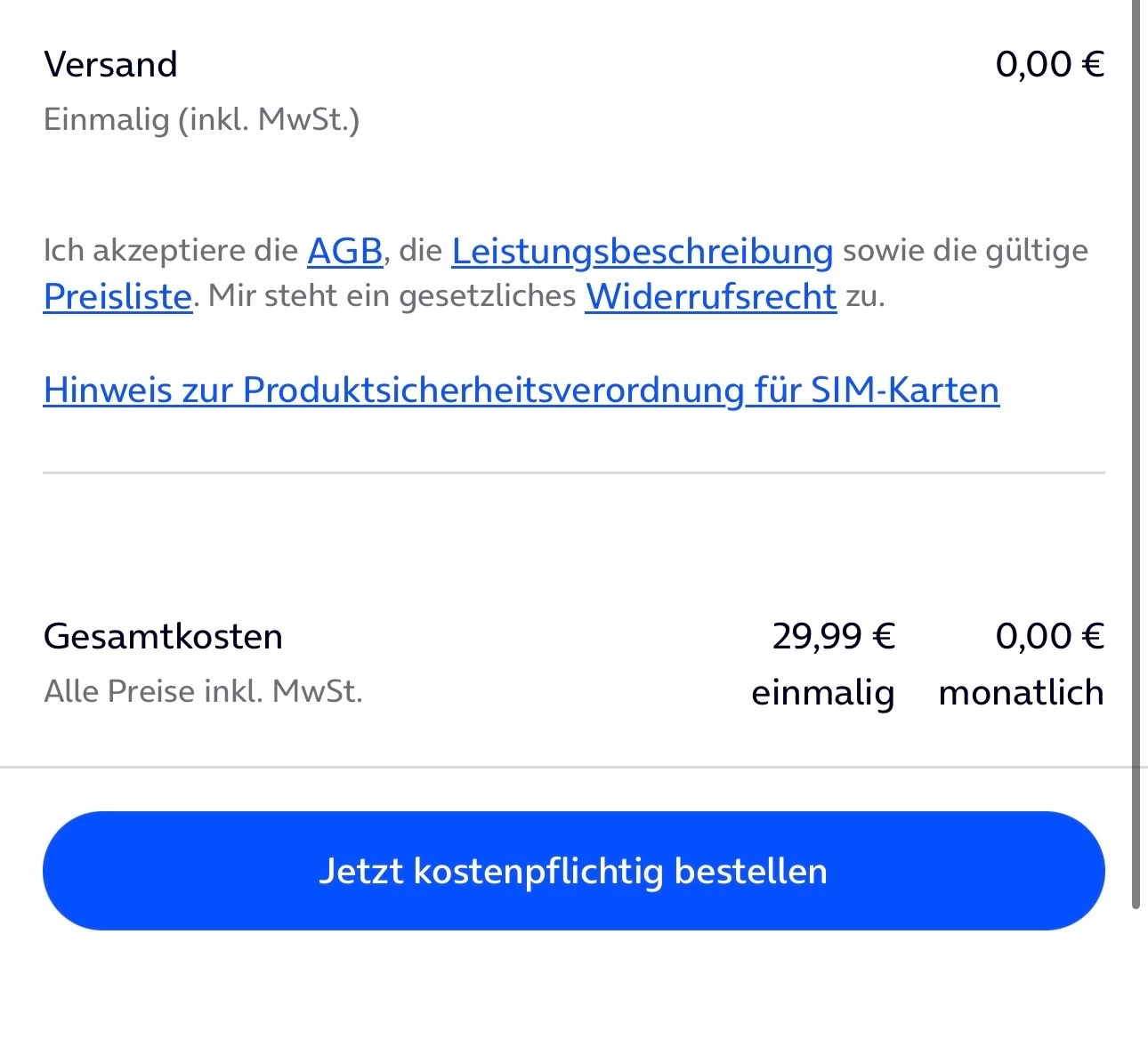 Beim Versuch, die SIM-Karten selbst zu bestellen, werden mir jedoch 29,99 € berechnet, obwohl mir der SIM-Kartentausch telefonisch als kostenlos zugesagt wurde.