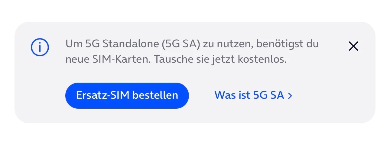 In der o2 App wird mir angezeigt, dass ich neue SIM-Karten benötige, da meine aktuellen Karten nicht 5G-SA-fähig sind.
