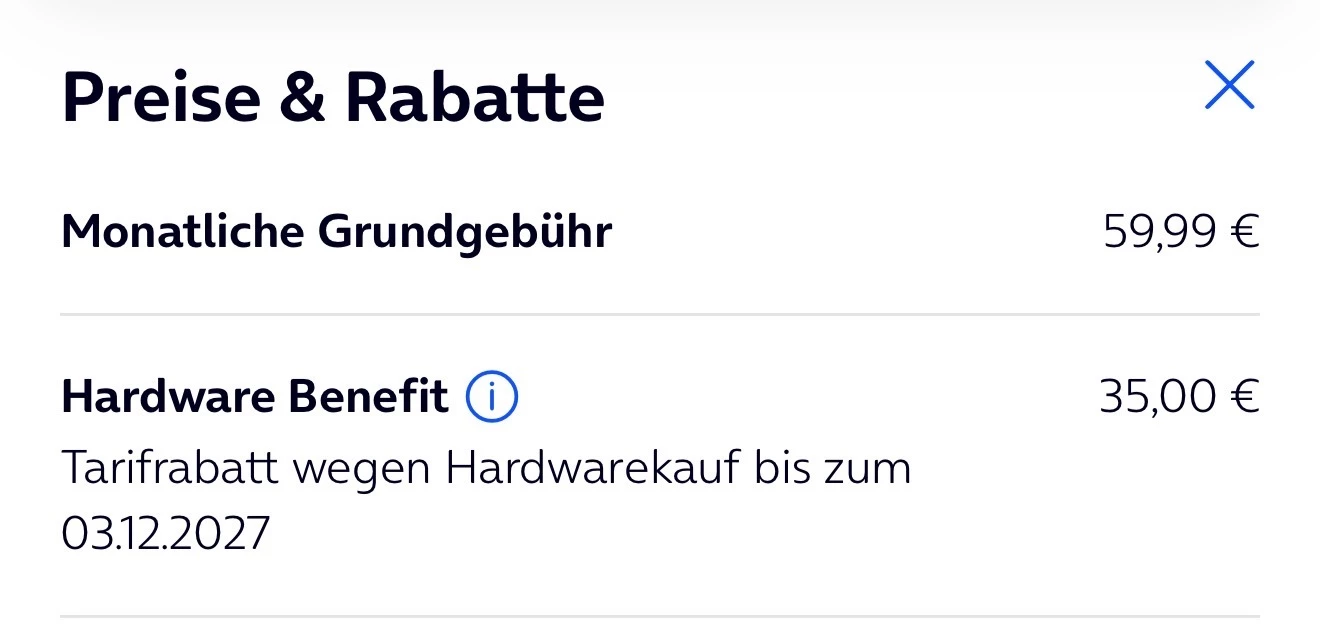 Magst du mal schauen? Wenn dein aktueller Hardware Ratenplan 36 Monate gilt, dann gilt auch der Hardwarerabatt bis 2027