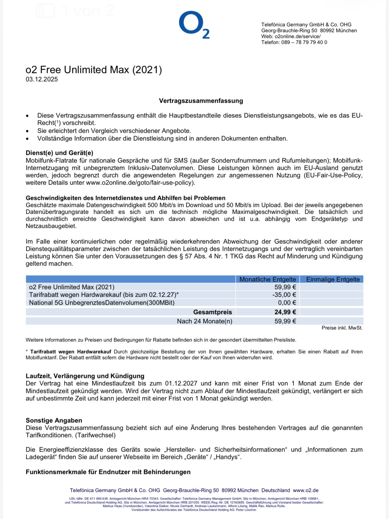 Also ich habe mal telefoniert mit o2 darüber und dann wurde mir eine Vertragsverlängerung gegeben über 2 Jahre, aber dann wurde mir mein Rabatt weggenommen, obwohl der Rabatt mir zugesagt wurde und in der Vertragszusammenfassung steht und jetzt geht der Vertrag ohne Rabatt weiter. Ich muss das jetzt stornieren lassen und auf mein alten Vertrag zurück mit dem Rabatt und dann wieder eine Verlängerung machen lassen, wegen den Fehler.