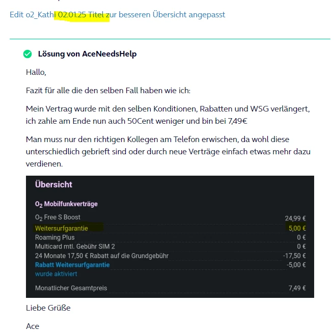 Hallo ​@junkun, schön, dass du dich meldest und an einer Vertragsverlängerung interessiert bist. Da einige Tage vergangen sind, wüsste ich gerne, ob du dem Tipp von Bumer gefolgt bist und deinen Vertrag über dem Livechat verlängert hast. Wenn noch nicht, können wir hier gerne für dich nachsehen.