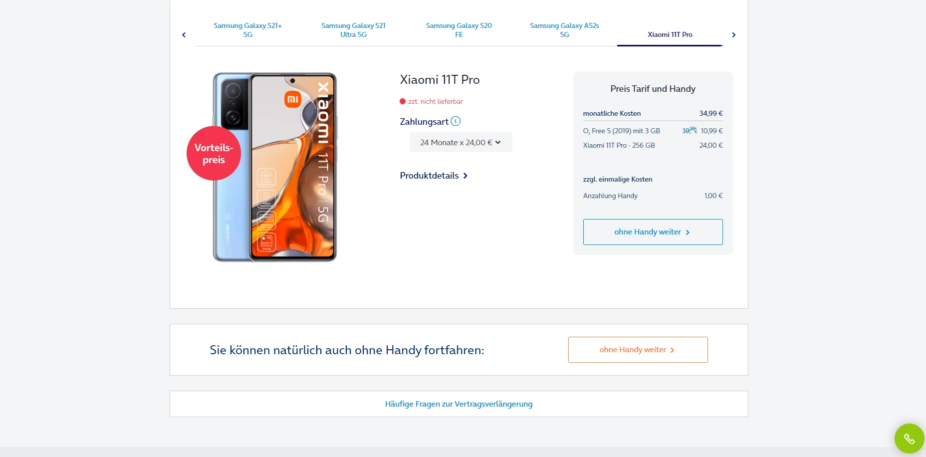 Hallo, ich wollte meinen Vertrag mit neuem Tarif und neuem Handy verlängern lassen und habe das hier gefunden. Allerdings steht hier, dass das Handy zzt. nicht lieferbar wäre, obwohl es als lieferbar dasteht, wenn man nur nach dem Handy sucht.