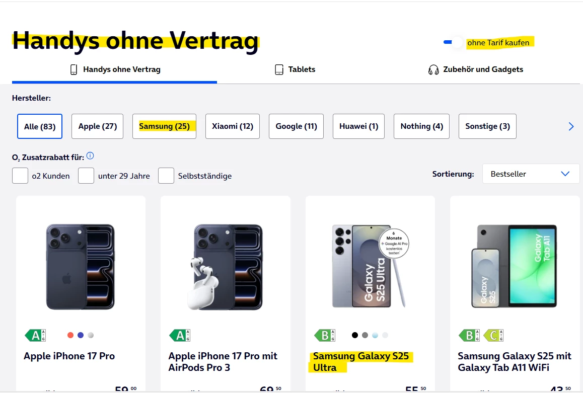 @NaAm2106 du kannst in unserem online Shop den MyHandy Vertrag mit dem Samsung S25 Ultra und dem gewünschten Ratenplan ganz bequem abschließen. Hier geht es zu unserem online Shop: Handys ohne Vertrag kaufen | o2