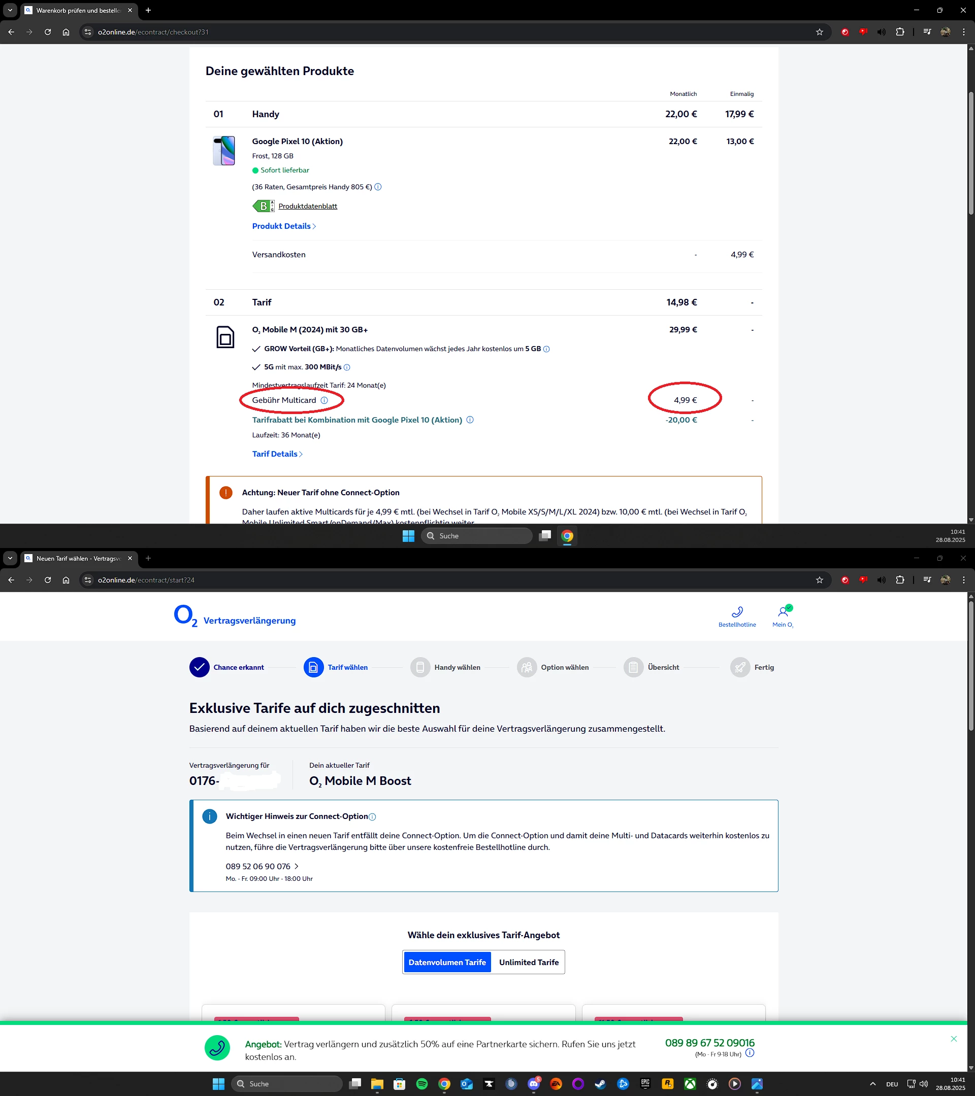 ich wollte meinen Vertrag online Verlängern jedoch wird mir dort eine Multicard Gebühr berechnet die ich nicht haben möchte (siehe eingekreist Screenshot). Im unteren Teil meines angehangenen Screenshots steht das ich meine kostenlose Connect Option weiterhin kostenlos nutzen kann wenn ich meinen Vertrag Telefonisch Verlängern würde.