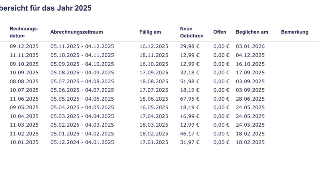 Okay, ich frage anders, was steht im Kundenportal unter Rechnung/Jahresübersicht bei fällig am und bei beglichen am? Ist das Datum identisch? Gerne einen Screenshot davon posten. Danke.