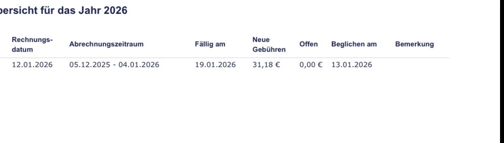 Also doch, mehrmals verspätet beglichen, und jetzt noch den Screenshot für 2026, also Abrechnungszeitraum 05.12.2025 - 04.01.2026!