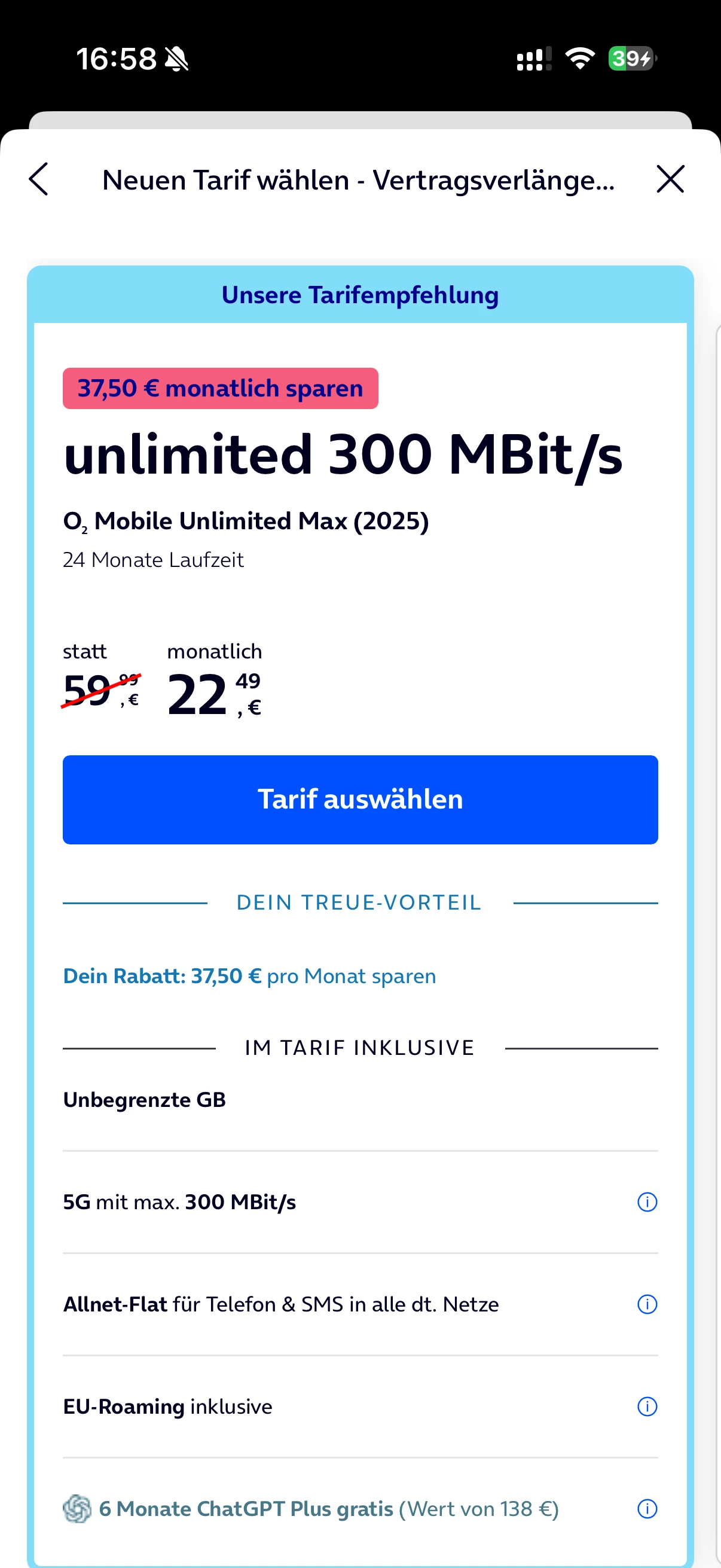Ich habe meinen Vertrag bei o2 abgeschlossen, weil mir ausdrücklich ein 6-monatiges ChatGPT-Abonnement als Geschenk versprochen wurde. Dieses Angebot war für mich ein entscheidender Grund für den Vertragsabschluss.