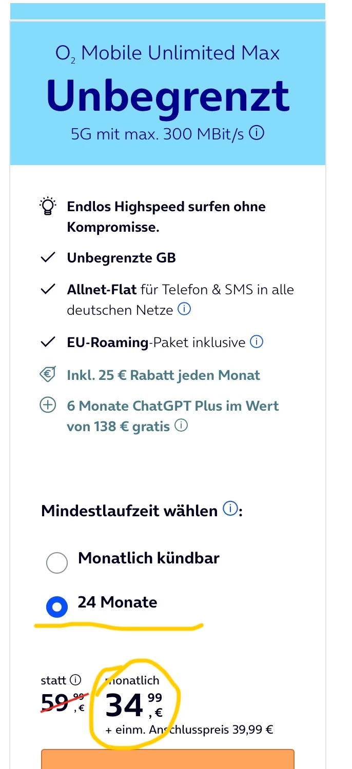 Möglich war: Unlimited Max 2025 für 34,99€ (nicht Flex). Dazu eine Multicard, die nachträglich auf 0€ rabattiert wird. Plus 6 Monate Chat GPT.