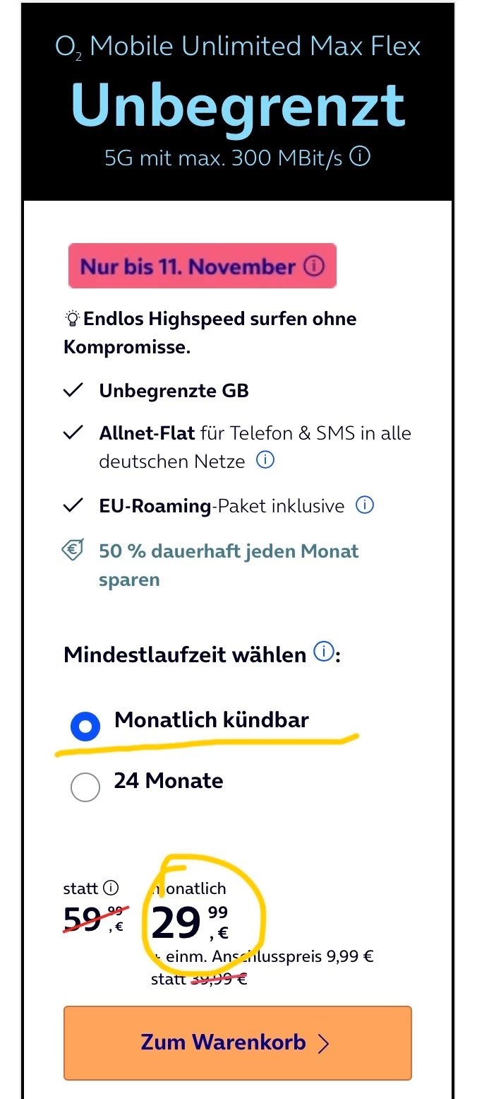 Ich habe die Screenshots nicht manipuliert, schaut mal. Da gibt es den Unlimited-Max-Tarif als Flex (monatlich) für 29,99€.