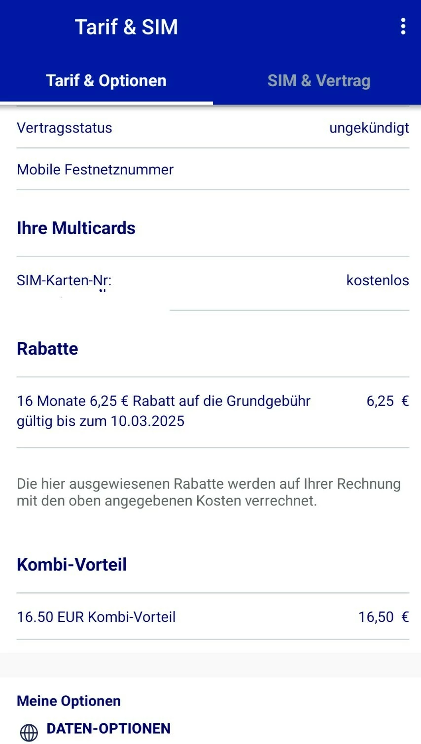 In der App sieht man es auch: Neben der Rufnummer auf Details, und dann weiter unten zwischen "Ihre Multicards" und "Kombi-Vorteil".