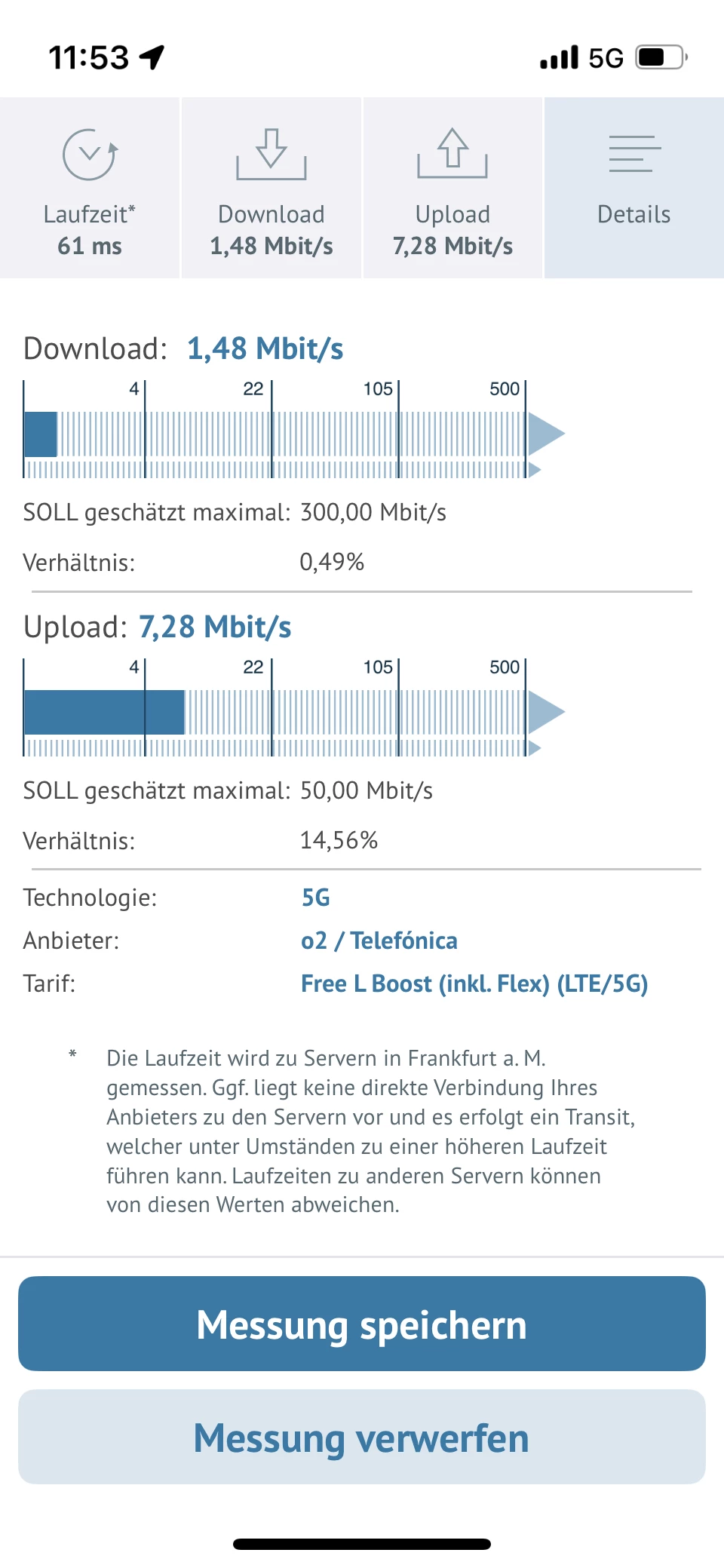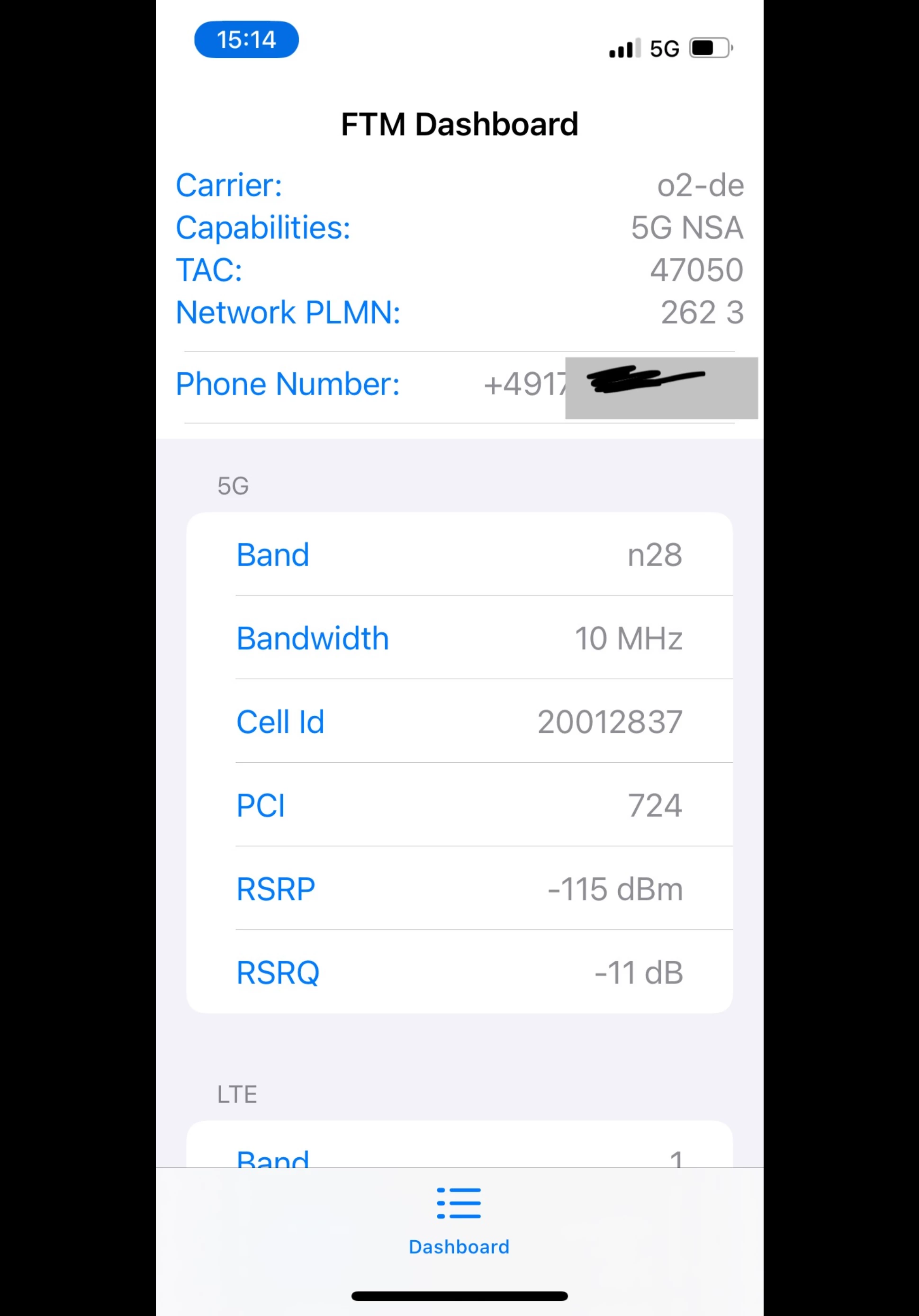 Er zeigt mir bei 5G N28, 10 Mhz, Cell ID 19972645 (Grüner Weg) aber schlechte Werte RSRP -119dBm