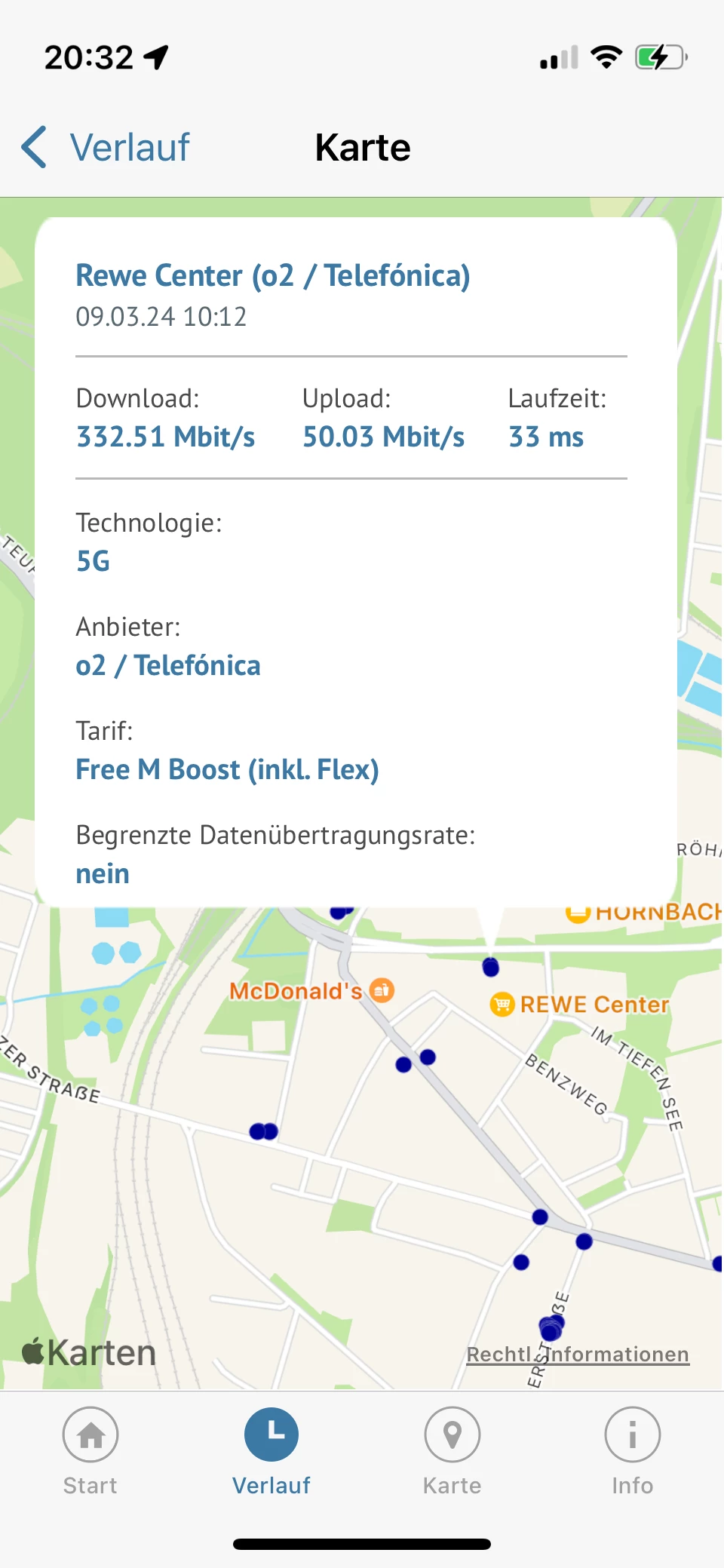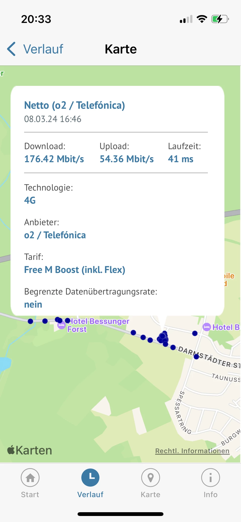 Samstag war ich zufällig bei Rewe in Darmstadt, dort gibt es wohl 5G SA und da hat mein iPhone sagenhafte 330 Mbit Download und der Upload hat sich von 80 Mbit auf 50 Mbit gedrosselt.