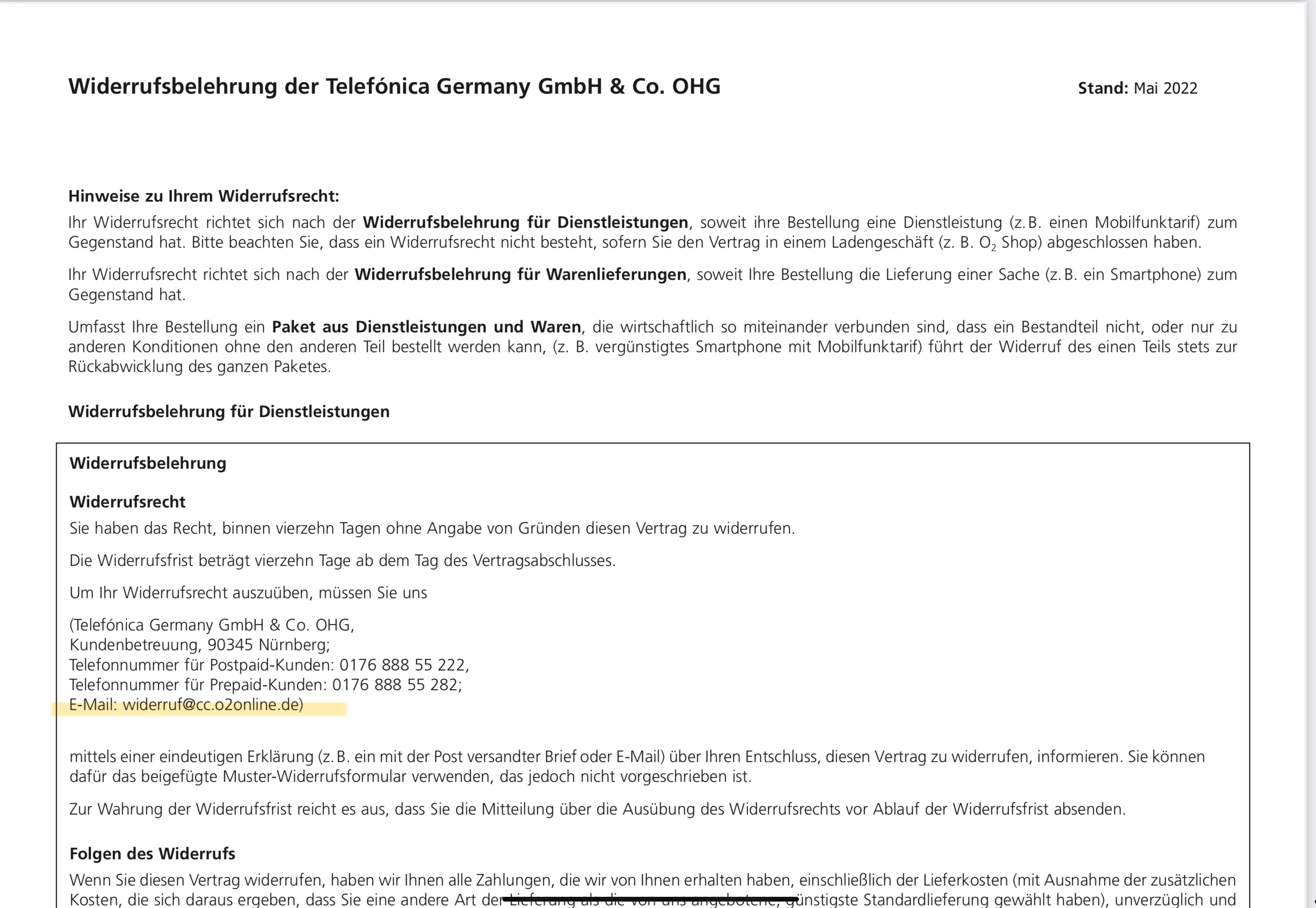 Der neue Vertrag wurde direkt telefonisch mit O2 abgeschlossen.  Wenige Tage nach Vertragskündigung. Ok, die genannte Mailadresse habe ich nicht gefunden und mich deshalb für den sicheren, "gerichtsfesten" Widerruf per Einschreiben entschieden. Ist ja auch angekommen und gesichtet worden, denn das wurde mir telefonisch vom O2 MA bestätigt. Nur schriftlich liegt halt nichts vor und in meinen Vertragsdaten hat sich 7 Wochen nach Widerruf nichts geändert. Die letzte Rechnung wurde auch bereits nach den widerrufenen, also falschen  Vertragsdaten abgerechnet.