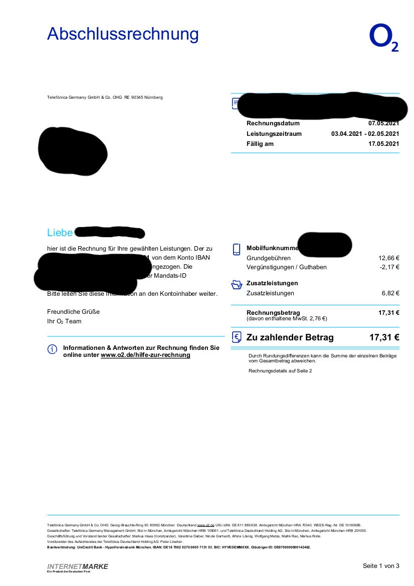 Hierzu eine kleine Erklärung: aus irgendeinem Grund hat O2 meine Kündigung vom 14. auf den 22. verlängert. Ich gehe davon aus, dass es deshalb gemacht wurde, weil die Rufnummer erst am 22. portiert wurde. Das wurde allerdings ebenfalls ohne Absprache mit mir durchgeführt, keine Email, kein Anruf, nichts. Hätte man mich darüber informiert, hätte ich die Verlängerung abgehlehnt. Ich hatte eine andere Simkarte, unter der ich erreichbar war. Ich hätte erst Recht keine 4€ für 5 Tage gezahlt.