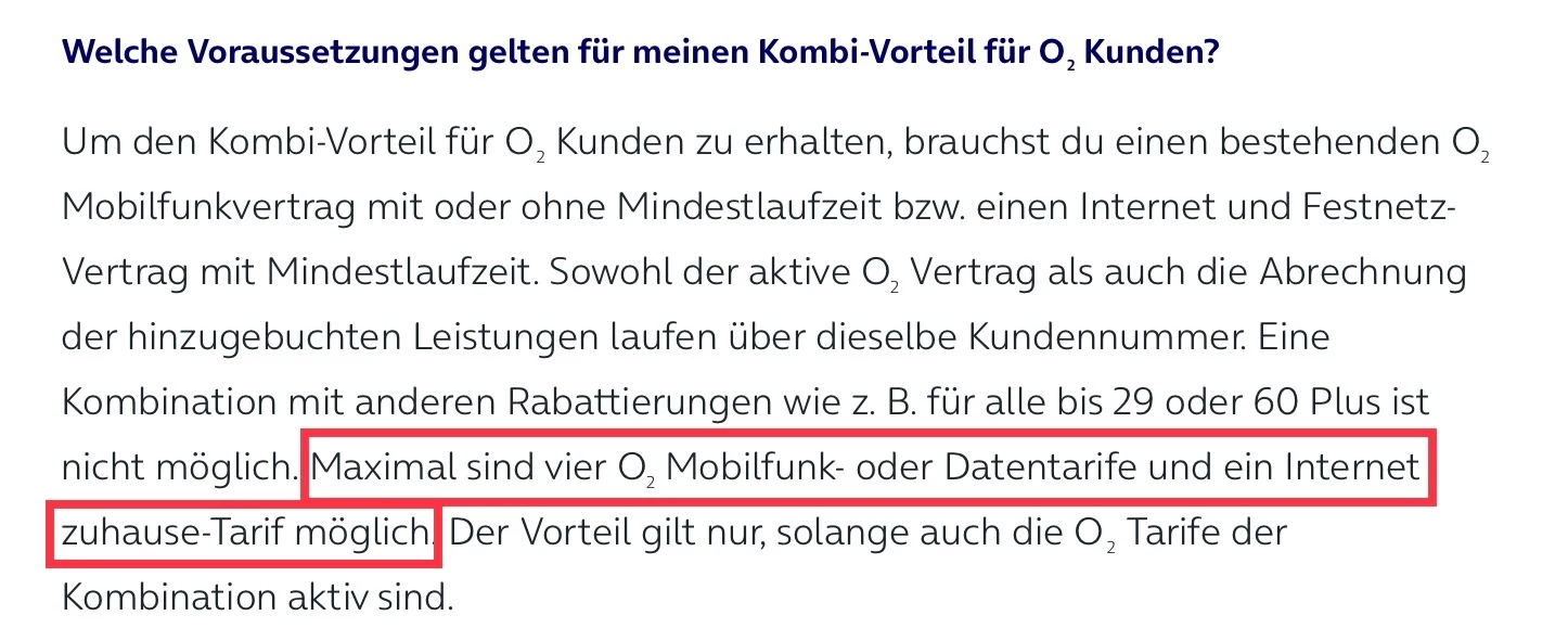 wie oben im Screenshot vermerkt, gehen 4 Mobilfunk oder Datenverträge und ein Festnetzvertrag. @0179LoopUP wenn du aktuell nur 2x Kombi-Vorteil erhältst, ist dein Limit noch nicht erschöpft. Sind die 48 Stunden bei dir schon um?