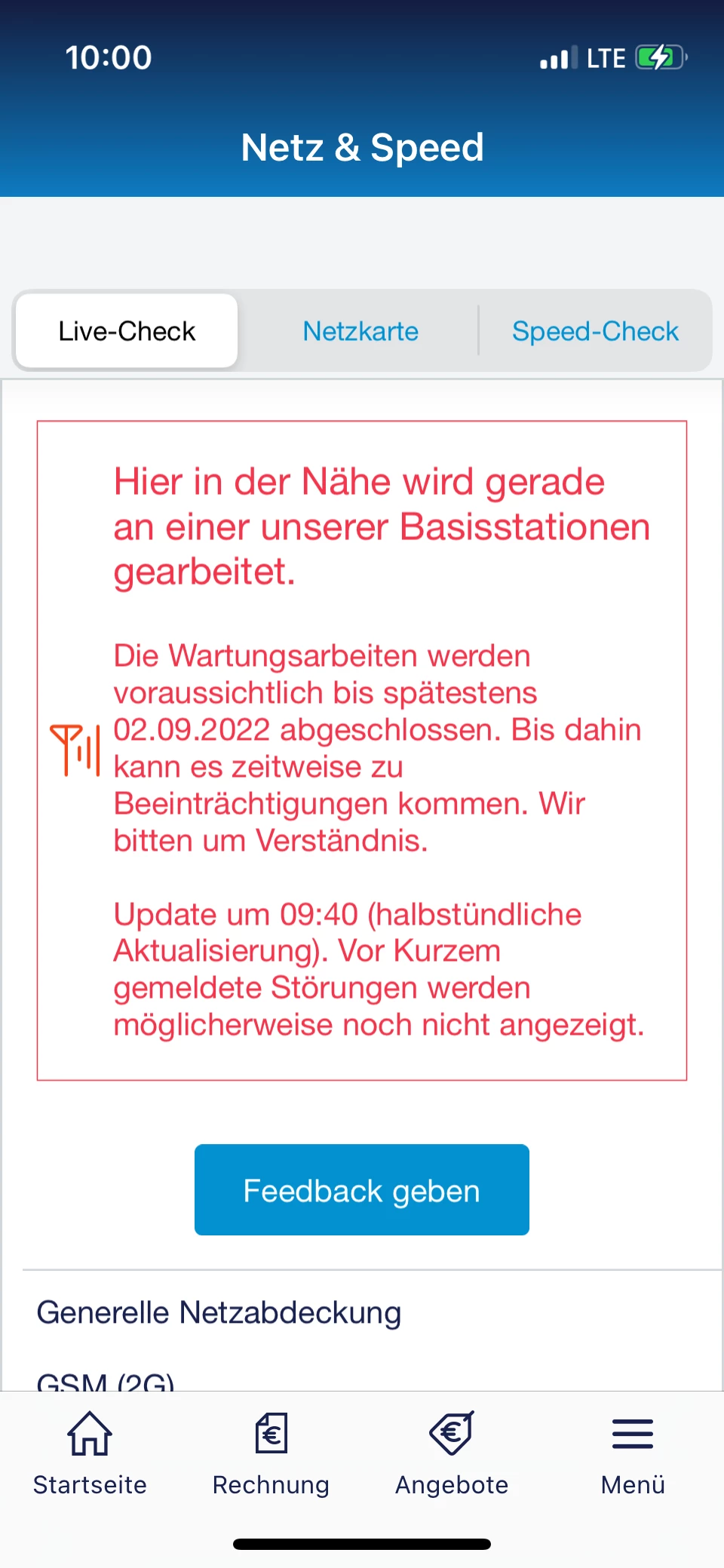 Auf dem Screenshot steht, dass Wartungsarbeiten bis zum 02.09. anstehen. Wie sieht es bei dir aktuell mit dem Netz aus?
