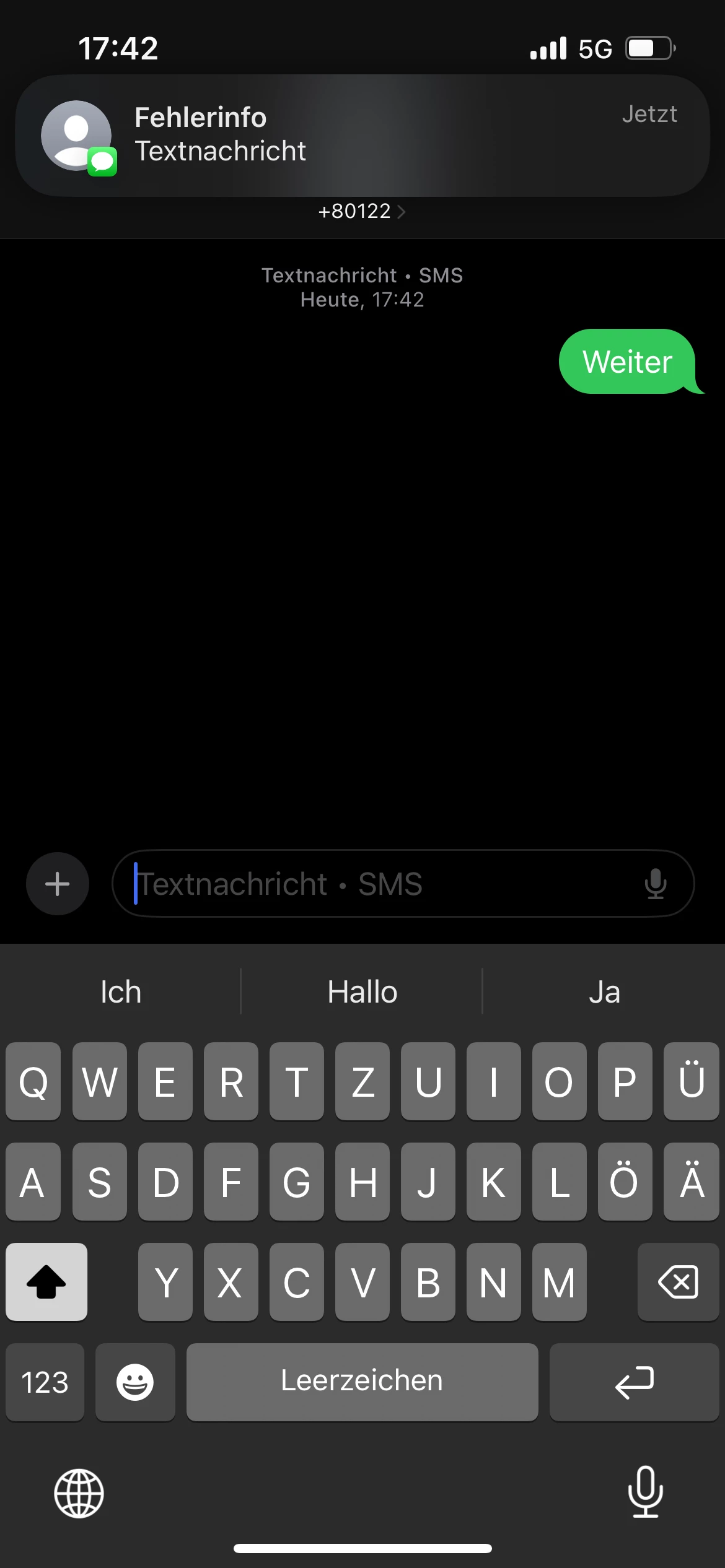 nichts funktioniert, es kommt auch bei der Nachricht das die Geschwindigkeit reduziert wird nichtmal mehr die Tastatur . Wenn ich dann wie oben beschrieben „WEITER“ an die 80122 send kommt die oben genannte Fehlermeldung!