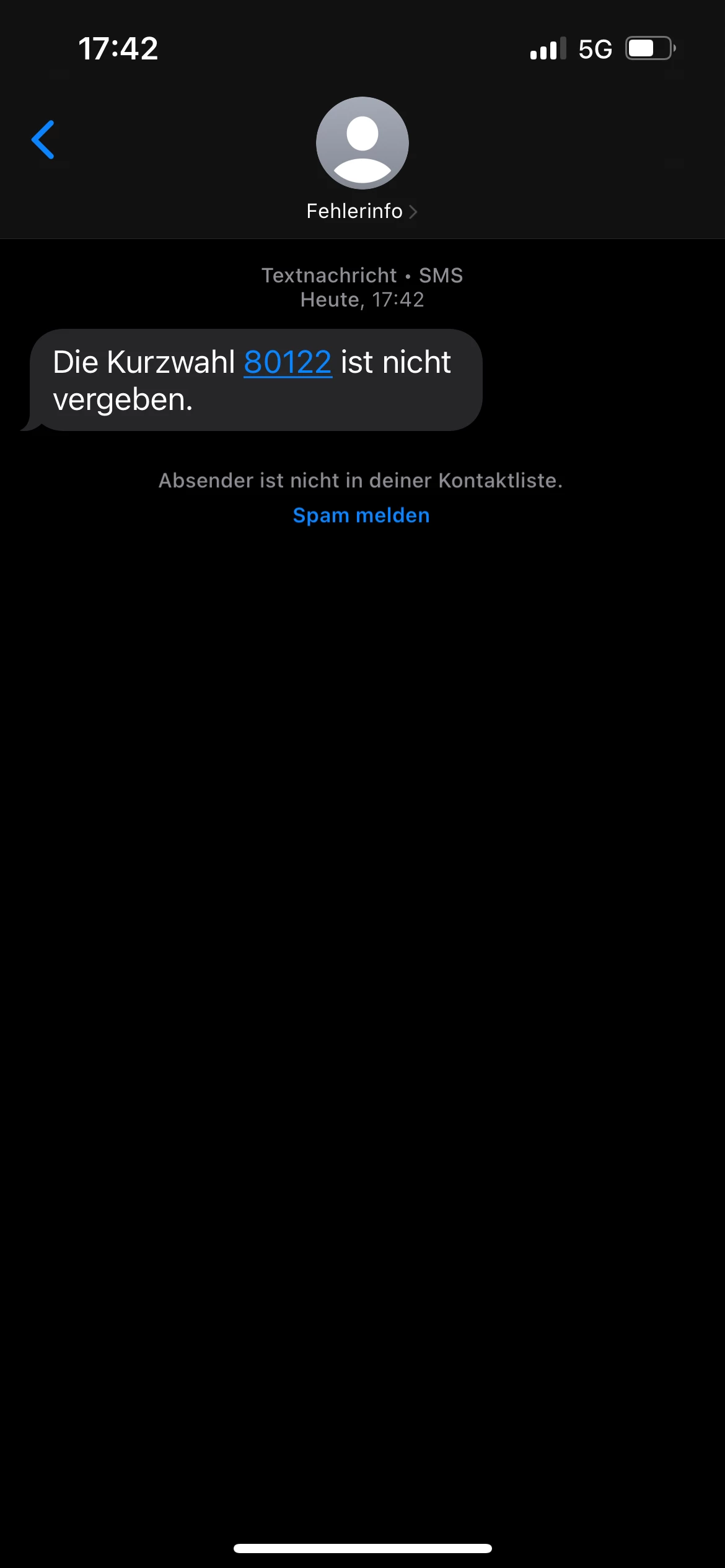 Danke für den Tipp, allerdings kommt da genau das gleiche ! Fehlerinfo, die Kurzwahl 80122 ist nicht vergeben