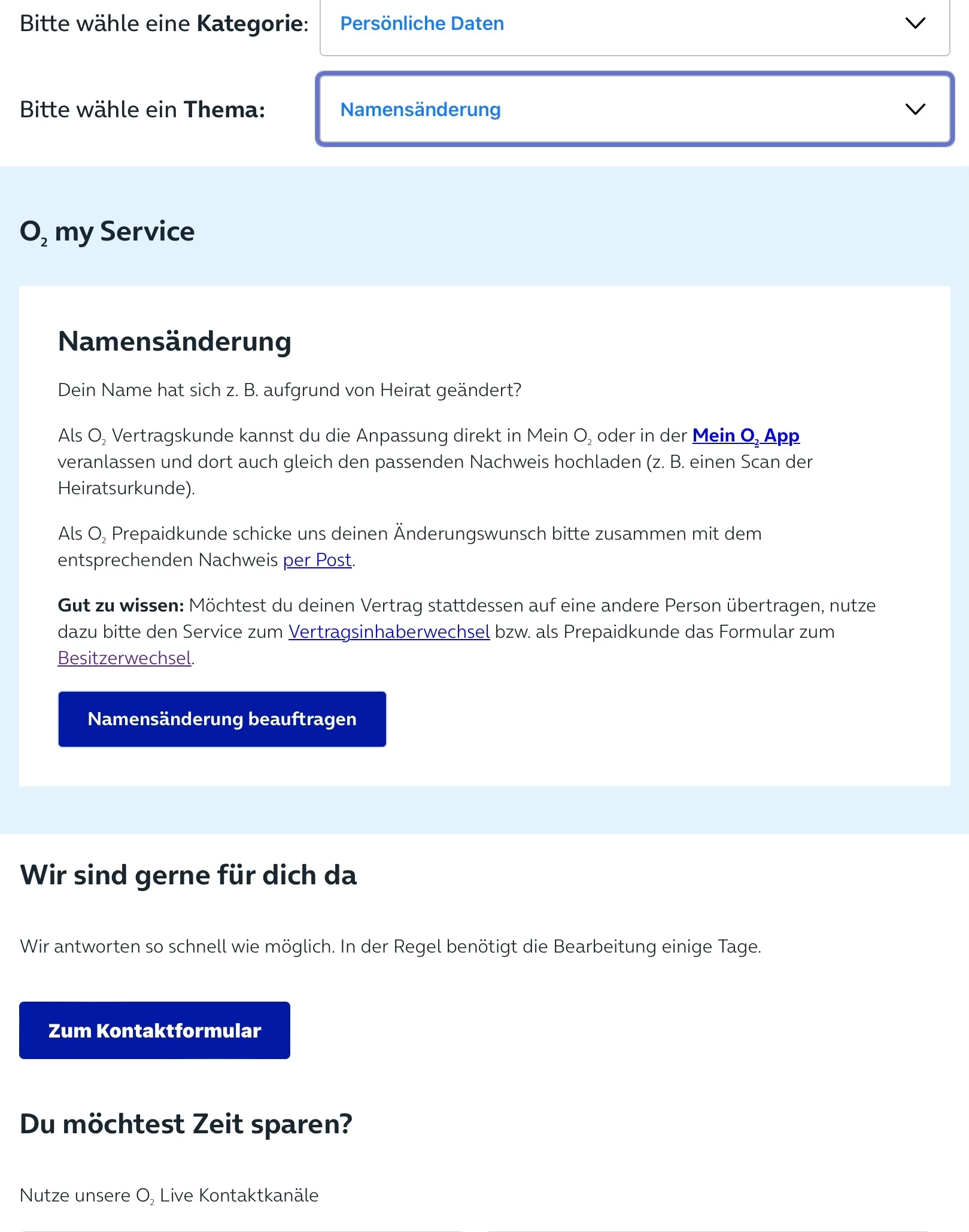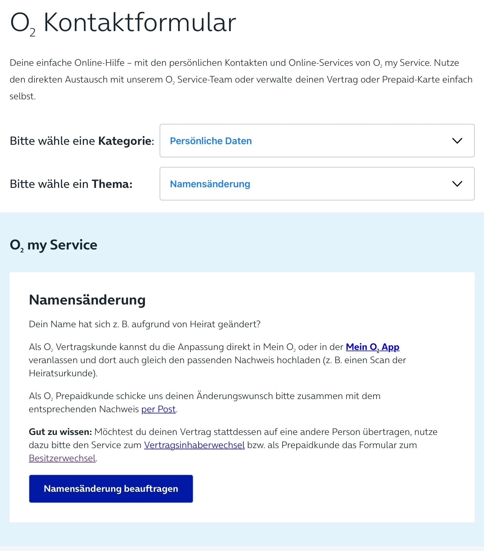 Hab es direkt im Vertag unter  “meine Daten” Namen ändern eingereicht.  Das beauftragen ist ja nicht das Problem, die Bearbeitung nach Einreichen scheint für O2 ein Problem darzustellen. Es kann ja nicht so schwer sein den Nachnamen im Vertrag anzupassen.