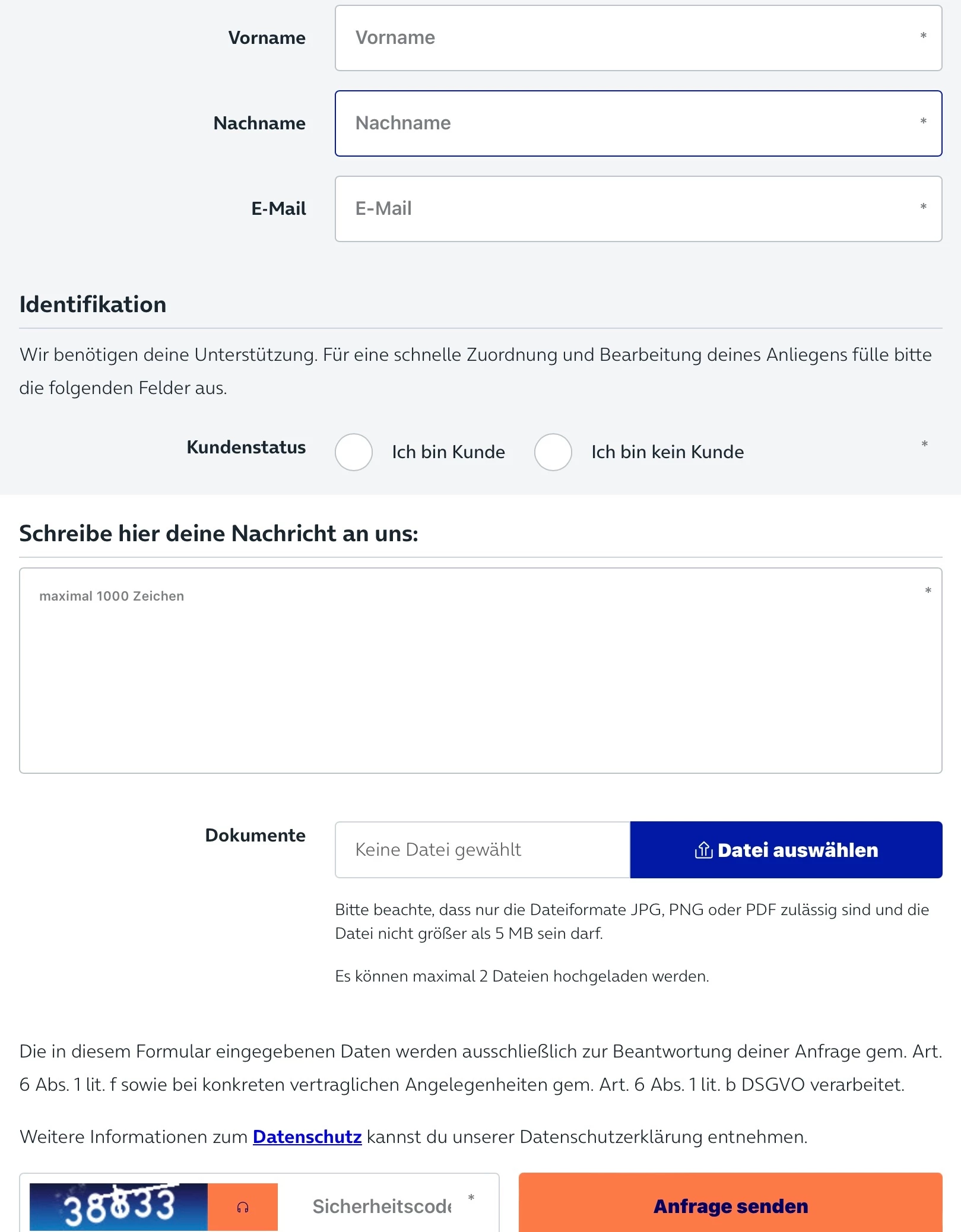 Ich bin nun über das Kontaktformular gegangen und werde letztlich auf die selbe Seite gelotst wo ich den Namen ändere und das Dokument hochladen kann.