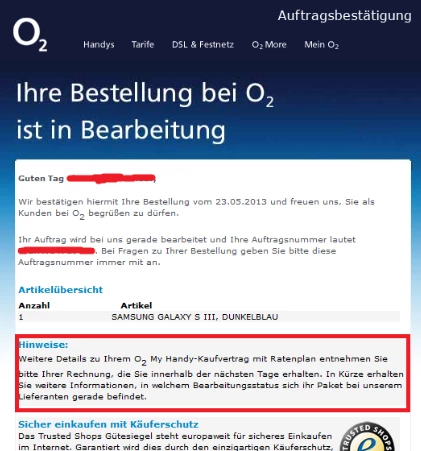 Ich hab mir gestern ein Samsung Galaxy S3 bestellt, und hab bisher zwei E-Mail's erhalten, die erste war eine Eingabsbestätigung und die zweite eine Auftragsbestätigung, in dieser zweiten E-Mail stande das ich in kürze, weitere Informationen bezüglich meiner Bestellung bekommen werde, allerdings hab ich seit gestern 16:00 Uhr keine weitere Erhalten, nun meine Frage ist das normal?, hab ich irgendetwas falsch gemacht oder sonstiges?.