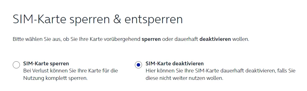 Mein Tarif ist O2 Free M. Unter dem angegebenen Link von Bielo kann ich nur sperren und auch das funktioniert nicht, sondern da gibt es eine Fehlermeldung. Ich habe eine SIM für mein Handy, eine SIM in eSIM für die Watch umgewandelt und eine 3. SIM für ein Zusatzgerät, welches ich nicht mehr habe. Genau diese SIM möchte ich praktisch kündigen, deaktivieren oder was auch immer, damit ich für die ungenutzte SIM nicht weiterhin €4,99- monatlich bezahlen muss.